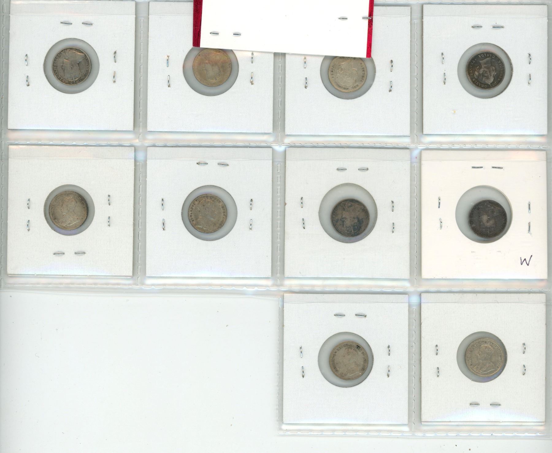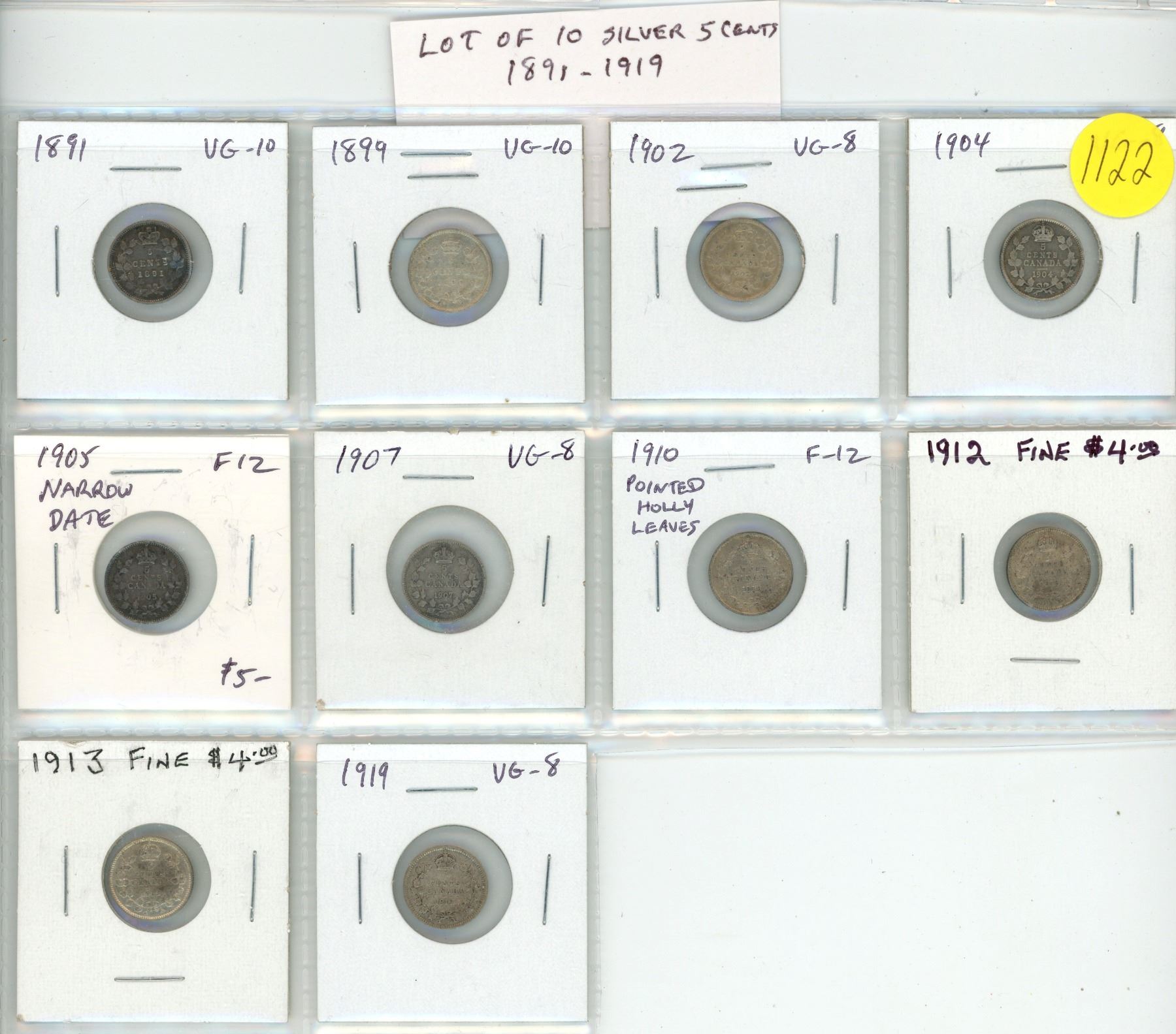 Lot of 10 Silver 5 Cents. Includes 1891, 1899, 1902, 1904, 1905 Narrow Date, 1907, 1910 Pointed Holly Leaves, 1912, 1913 & 1919. Coins grade VG-8 to F-12.