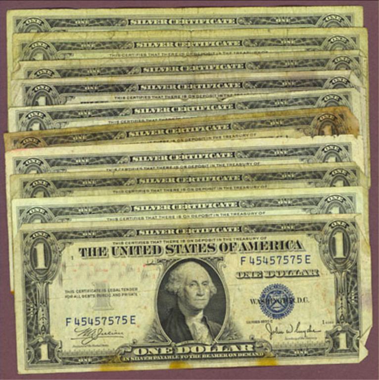 A lot of 10 circulated SIlver Certificates.