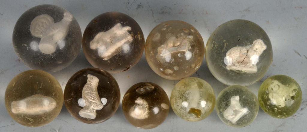 Description Includes a rooster, rabbit, fish, cow or buffalo, bird, two dogs, and three lambs. Seated dog has a large piece broken off bottom and one lamb has some cloudiness with minor dings overall. Condition (Very Good). Size Largest: 2".