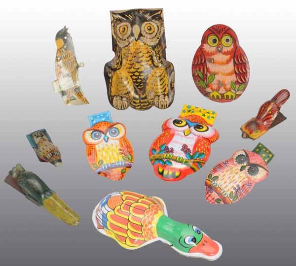 Description Japanese. Includes six owl, two duck, and two bird toys. Some are marked "Made in Japan", one is marked "Made in USA", and one is marked "Japan" along with "Bob-Olink Shoes for Young Folks". Condition (Very Good - Excellent). Size Largest: 3" L.