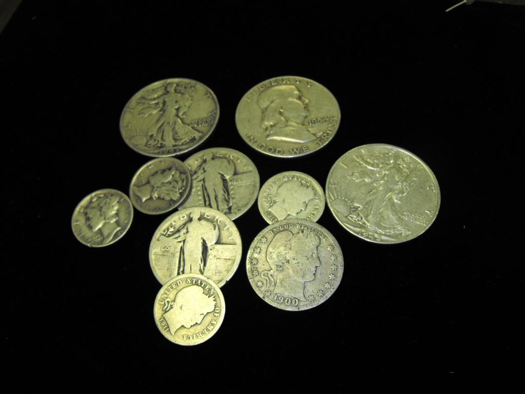 (3) 90% Halves- 2 WL-1 Franklin- (3) 90% Quarters- 2 SL- 1 Barber- (4) 90% DImes- 2 Barber-2 Mercury- Coin dates will vary- You will receive the total coins you see in the picture. They may be different dates and grades.