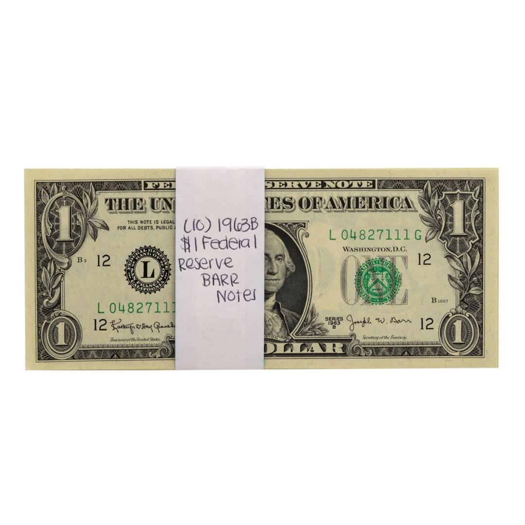 One Lot of (10) Uncirculated 1963B $1 Federal Reserve BARR Notes.
