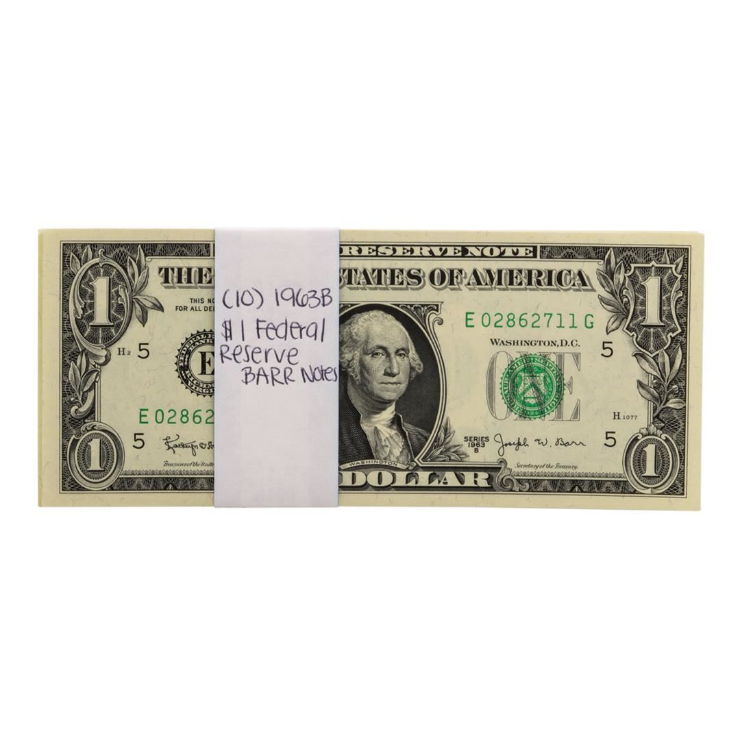 One Lot of (10) Uncirculated 1963B $1 Federal Reserve BARR Notes.