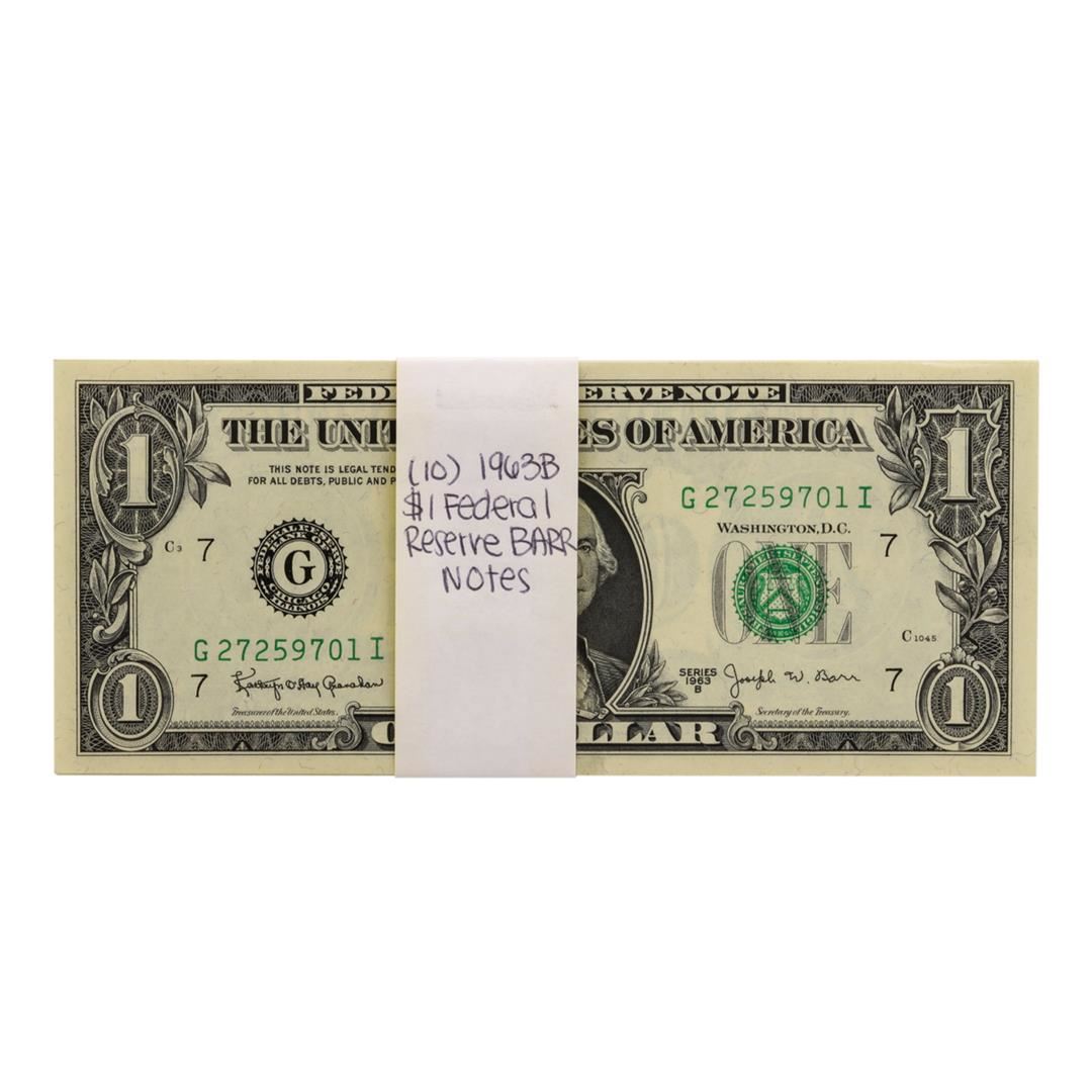 One Lot of (10) Uncirculated 1963B $1 Federal Reserve BARR Notes.