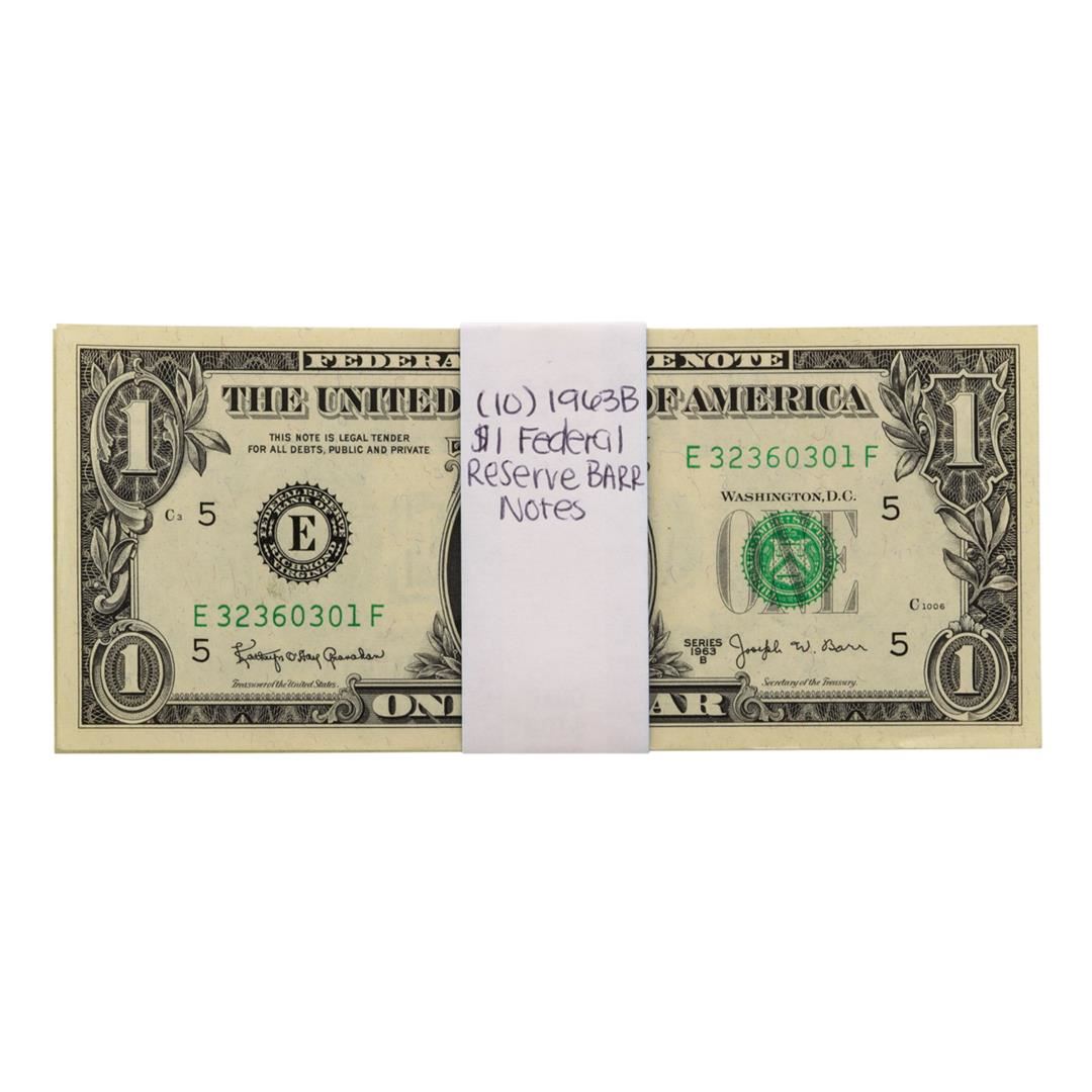 One Lot of (10) Uncirculated 1963B $1 Federal Reserve BARR Notes.