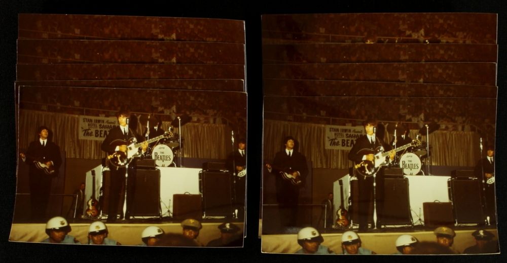 Lot includes 10 photos that are 7x5" in size. Photos show The Beatles in concert at Hotel Sahara and shows members John Lennon, Paul McCartney, Ringo Star and George Harrison. Some photos have "Silver Screen Prod, Inc. 1979" stamped on the back.