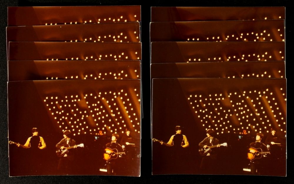 Lot includes 10 color photos that are 7x5" in size. Photos show the Beatles in concert and pictures members John Lennon, Paul McCartney, George Harrison and Ringo Starr. Some photos have "Silver Screen Prod, Inc. 1979" stamped on the back.