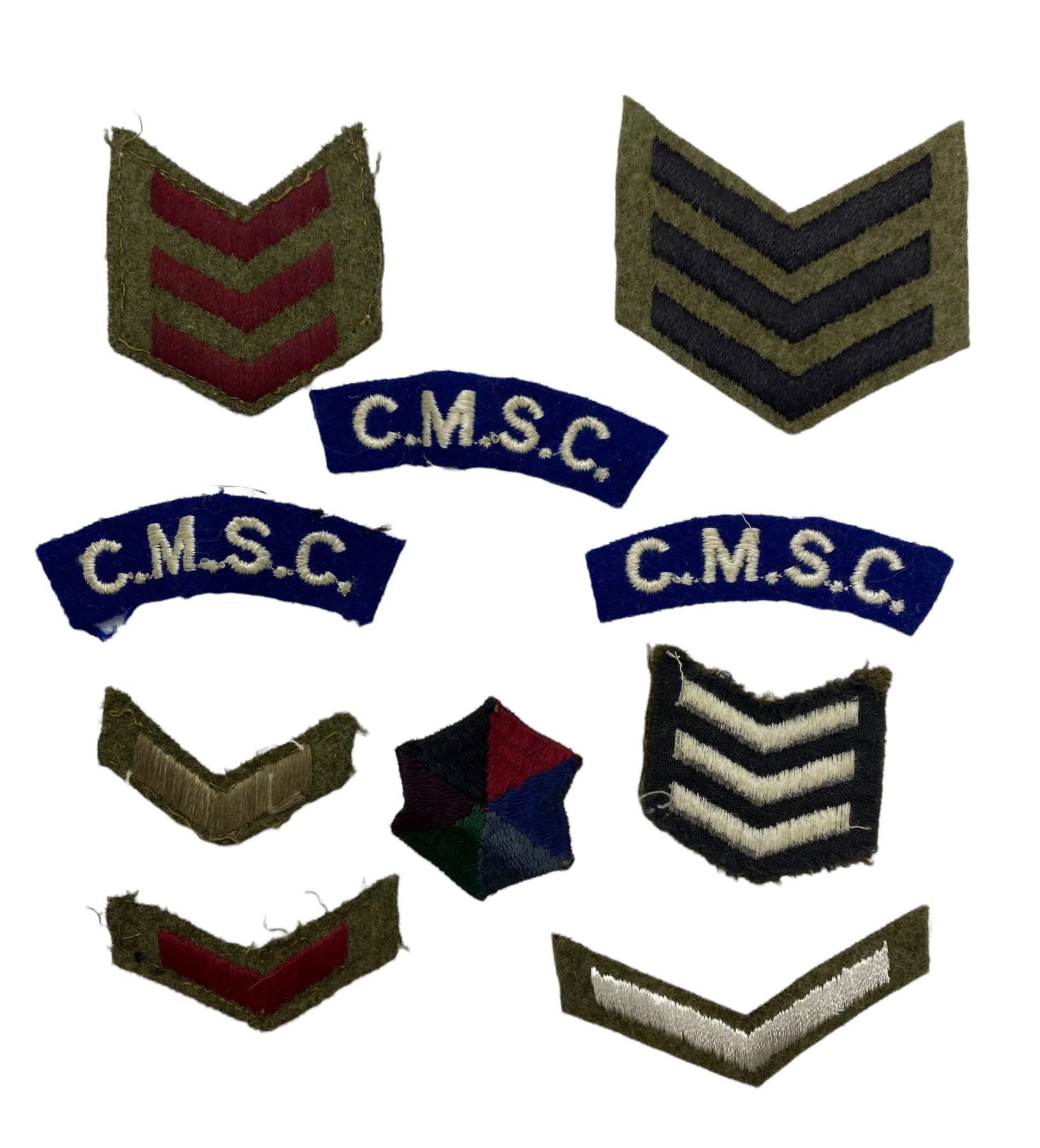 Lot consists of various service chevrons, and CMSC (Canadian Military Staff Clerks), one small pacific force div patch.