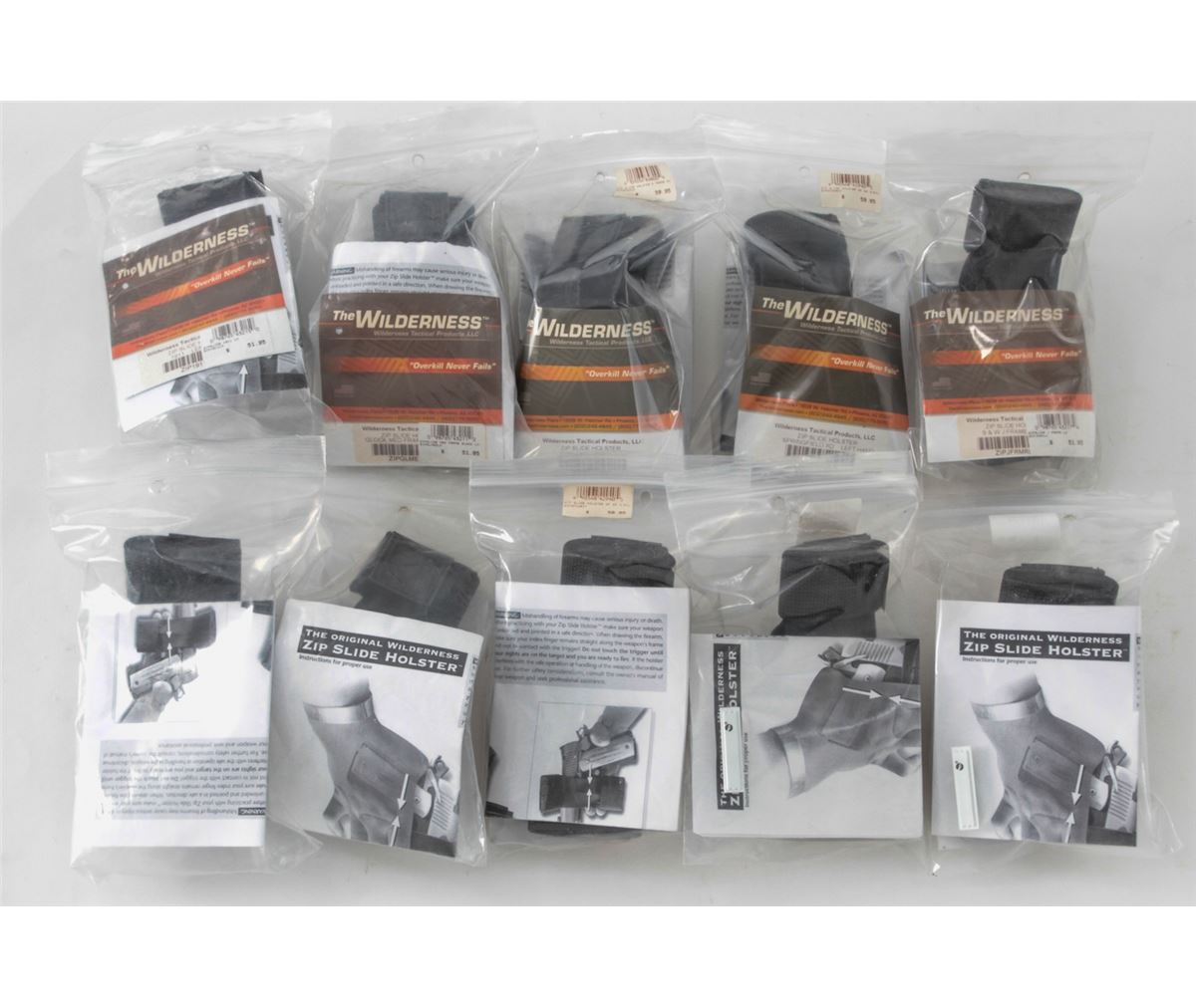Lot of Ten (10) The Wilderness Zip Slide Holsters, for 1911s, S&W J- & K-Frames, Glock large & medium frames, Springfield XD. All brand new in original packaging. Retails @ $500/lot. Est.: $250-$350/lot. (Field Time)