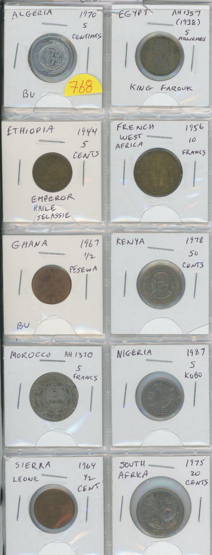 Lot of 10 coins from 10 different African countries: Algeria, Egypt, Ethiopia (Emperor Haile Selassie), French West Africa, Ghana, Kenya, Morocco, Nigeria, Sierra Leone, South Africa.