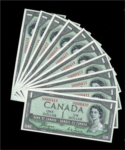 Lot of 10 consecutive low serial number Devil's face notes. 1954 $1 BC-29a A/A0000410 to 410. All Gems. Superb run!