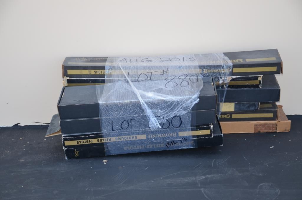 Lot of 10 misc. Browning empty factory cardboard shotgun boxes, mostly black, various models; improve the value of your unboxed guns or great for the gun show circuit. Est.: $100-$150.