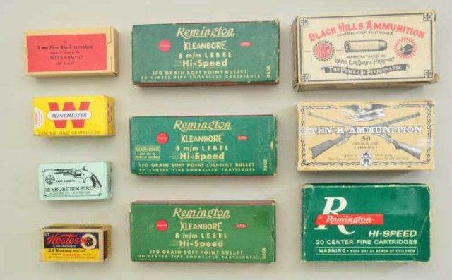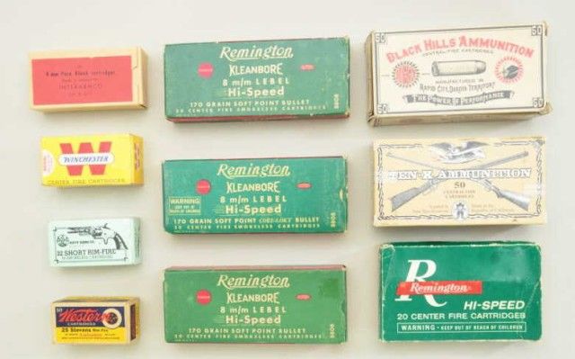 Lot of 10 misc. boxes of ammo including 3 boxes of Remington Kleanbore Hi-Speed 8mm Lebel ammo; a box of Winchester .32 Colt New Police; a box of Western .25 Stevens Rim Fire; a box of Black Hills Ammunition .45Schofield; a box of Ten-X .38-40 loaded to Sass Specifications; a box of Navy Arms .32 Short RF; a box of 9mm blanks (6 of rounds have been fired) by Interarmco and a partial box of .30-06 Springfield by Remington.Est.: $75-$150.