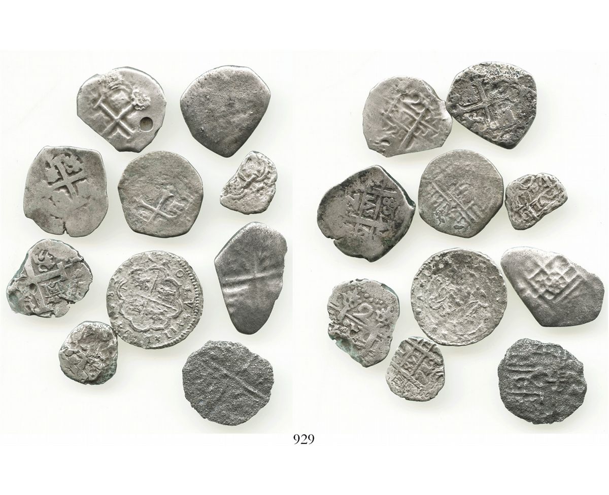 Lot of 10 miscellaneous small silver cobs (including one "pistareen") from various wrecks, including Atocha (1622) and Joanna (1682). 44.6 grams total. Mostly 2 reales, all silvery from cleaning and all but one corroded, generally decent crosses, the Atocha coin Grade 4. The Atocha coin with original Fisher certificate #169530 and pedigreed to the Ponterio auction of March 1995, with original lot-tag #1767.. Recovered from: Miscellaneous wrecks