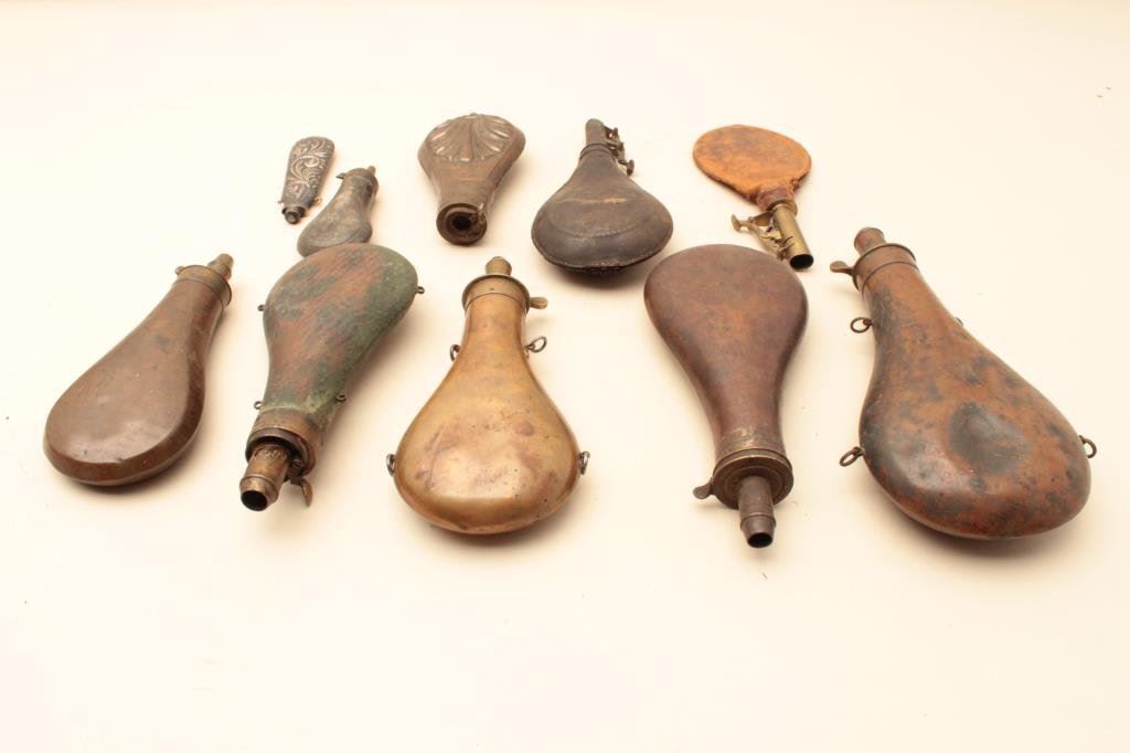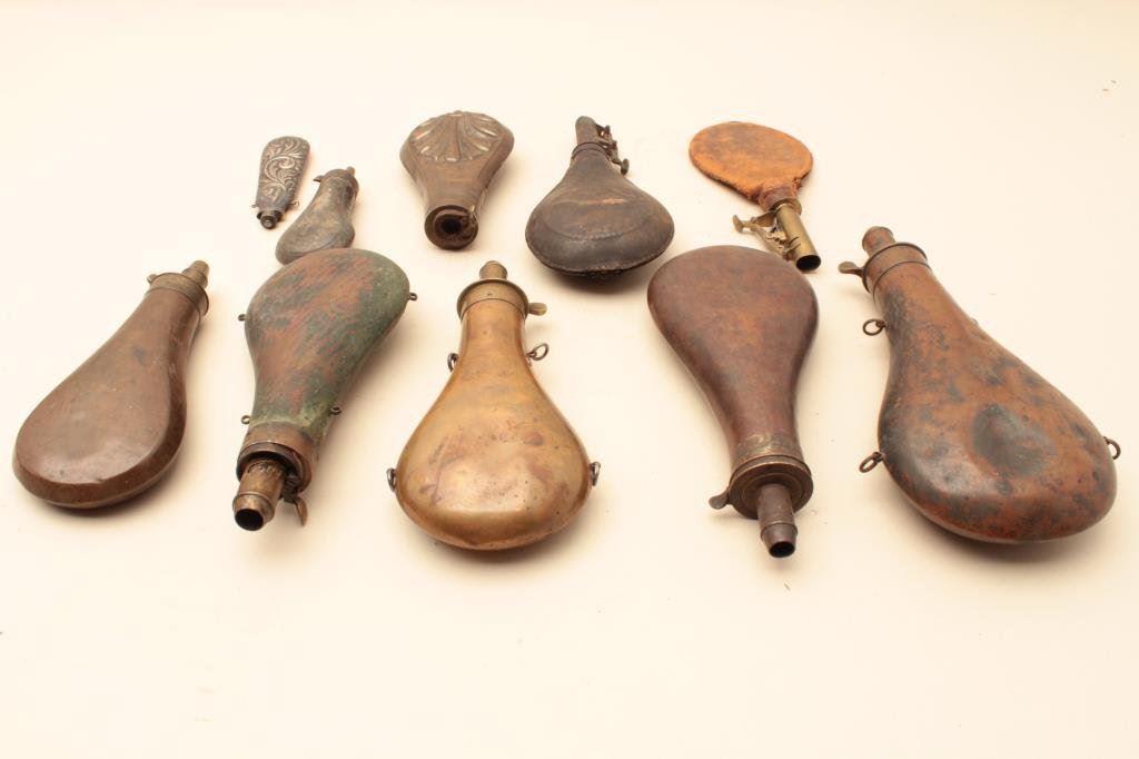 size shotgun flask. Circa mid-19th century showing heavy patina and 1 spring broken. Variable chargers. About 9” to 10” tip to end. Some dents. Unmarked or not legible. Along with embossed leather shot flask in poor to fair condition. Shell design flask very good with no spout. Dixon flask with 3 stage charger and 4 hanger loops in good condition. Poor shot flask. Zinc pistol flask with eagles. Fancy scroll design silver flask with screw top and small hangers that looks French and early 19th century in good condition. Est.: $150-$300