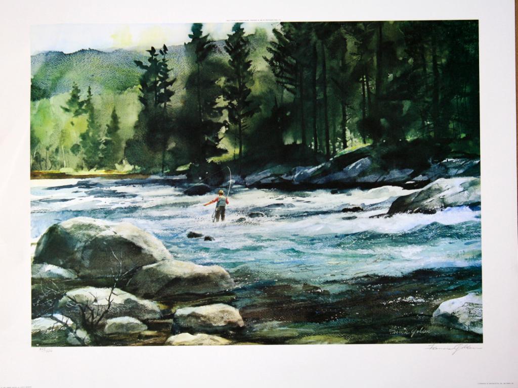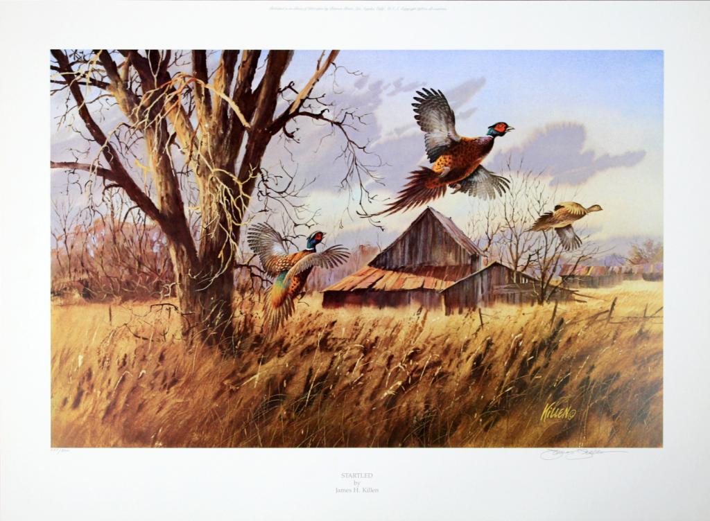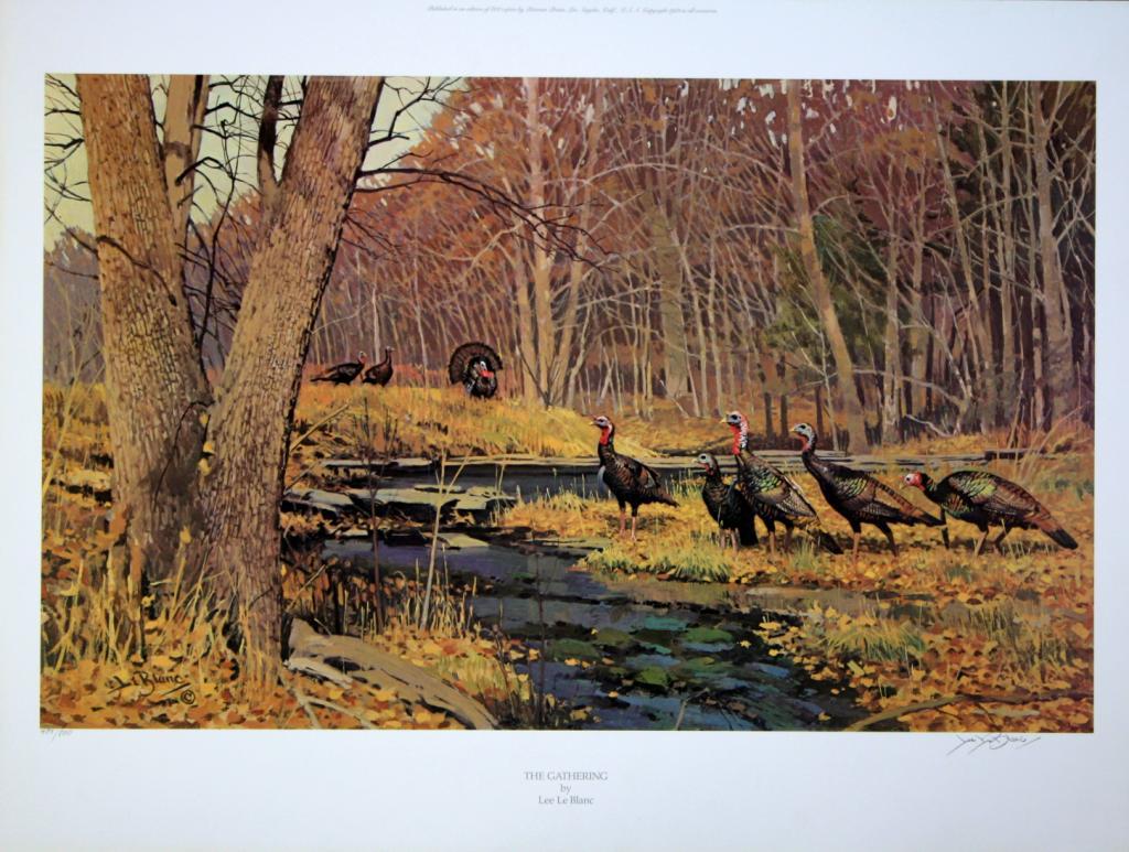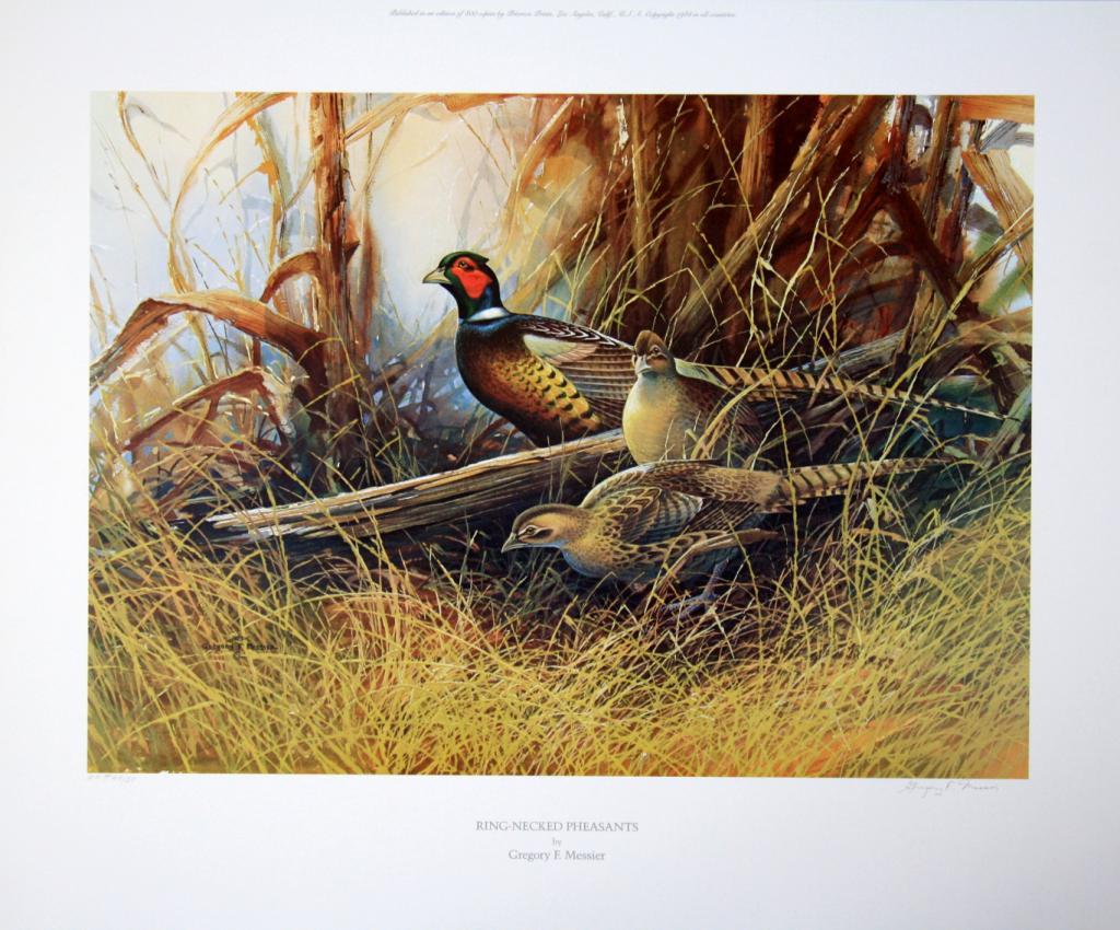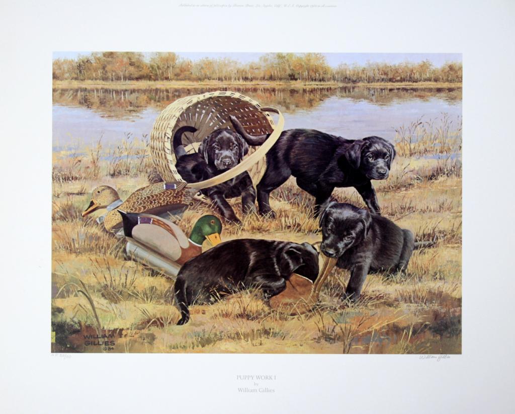 Lot of 10 prints consisting of: A) "Wyer's Pool" by Peter Corbin signed and numbered 192/400. Image size approx. 19"w x 14"h. B) Untitled print by Francis Golden signed and numbered 388/750. Image size approx. 24 3/4"w x 18 1/4"h. C) Artist's proof "An Obion River Memory" by Lee LeBlanc signed and numbered 50/50. Image size approx. 25"w x 17"h. D) Artist's Proof signed and numbered 50/50 entitled "Puppy Work I" by WilliamGillies. Image size approx. 19"w x 14"h. E) Artist's proof signed and numbered 50/50 entitled "Puppy Work II" by William Gillies. Image size approx. 19"w x 14"h. F) Artist's proof signed and numbered 44/50 entitled"Ring-Necked Pheasants" by Gregory F. Messier. Image size approx. 20"w x 14 1/2"h. G) "Startled" by James H. Killen signed and numbered 633/800. H) "The Gathering" by Lee LeBlanc signed and numbered 489/800. Imagesize approx. 25 1/4"w x 16"h. I) Matted print "Summertime in the Canadian Arctic-Ross' Geese" by Peter Scott, signed. Image size approx. 20 3/4"w x 14"h. J) Matted print entitled "Valley Quail" by Douglas Van Howd.