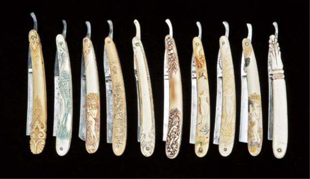 Lot of 10 straight razors with fancy (French ivory or cast cellulite) handles. Blades marked Hibbard, Spencer, and Bartlett. Other manufactures and hardware stores as well. Blades good to near fine, handles show nude ladies, Indians, crane, and decorative motifs. Valued to $150 ea. Est: $300 - $600