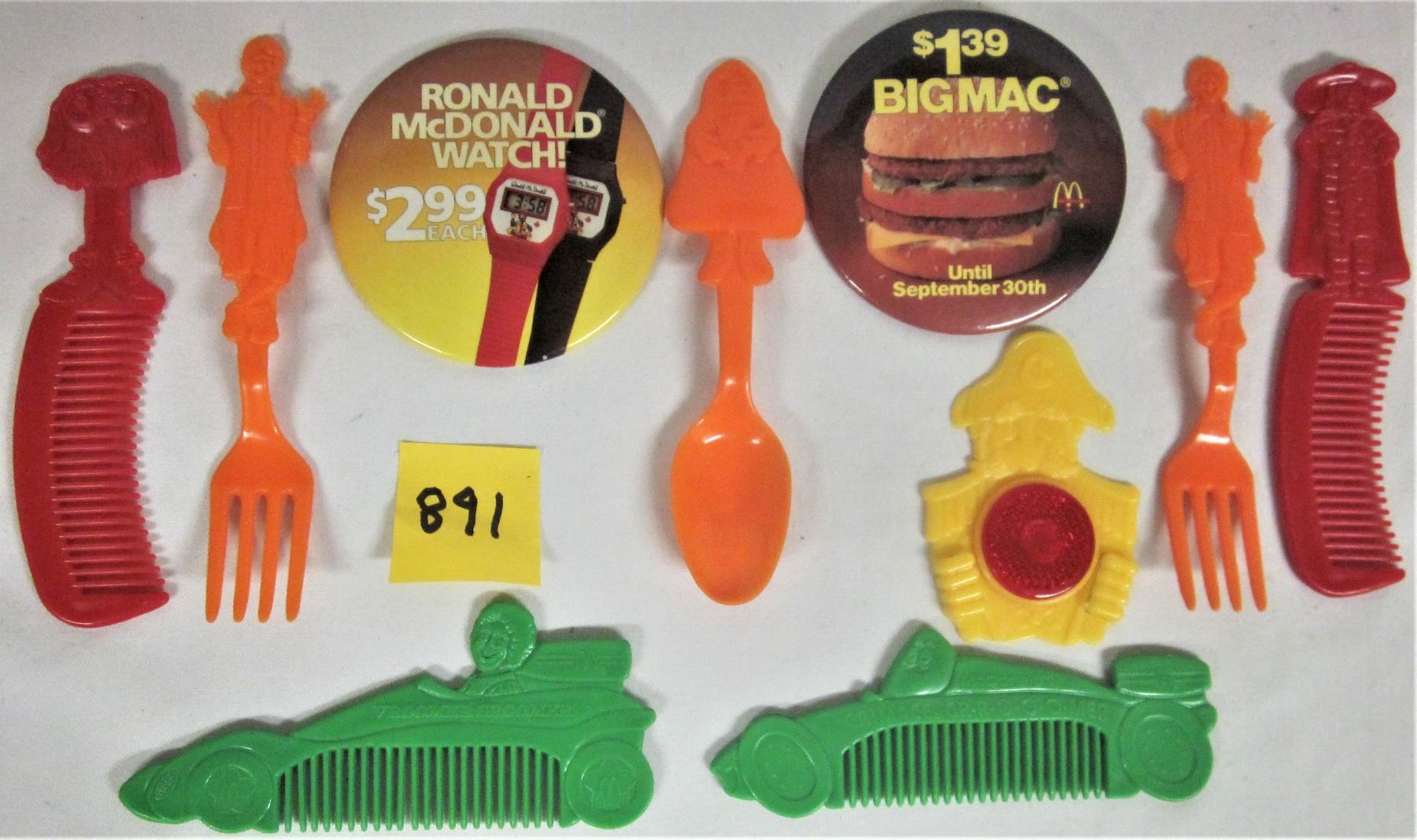 Lot of 10 vintage McDonalds collectible combs, spoon, 2 forks, 2 pin back buttons