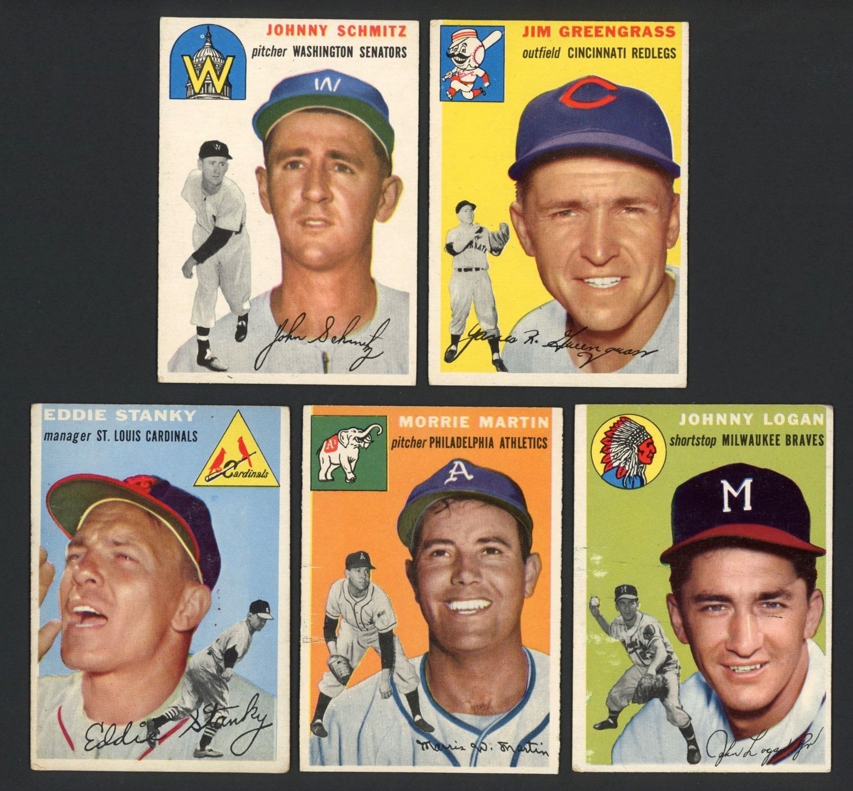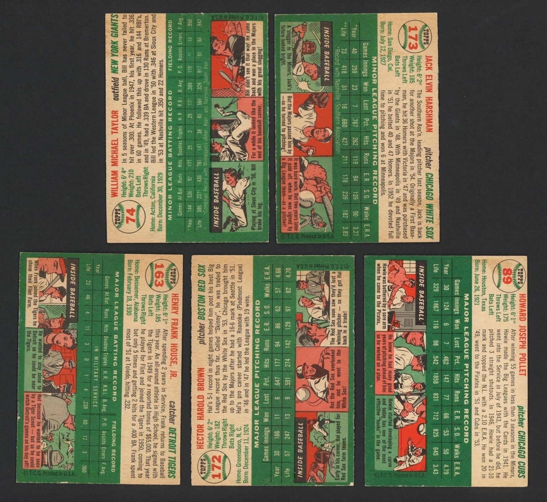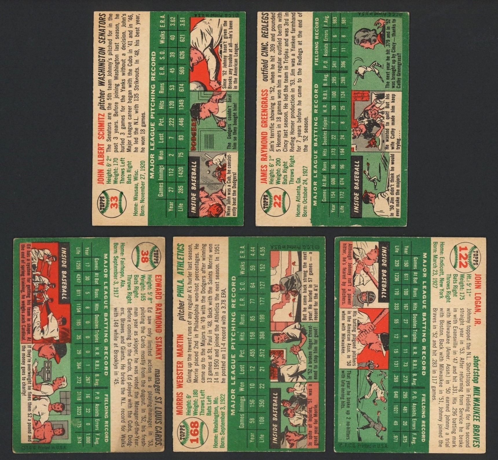 Excellent value here in this solid mid-grade lot, includes: #22 Jim Greengrass EX, #33 Johnny Schmitz EX+, #38 Eddie Stanky VG-EX, #74 Bill Taylor RC VG-EX, #89 Howie Pollet EX, #122 Johnny Logan VG-EX, #163 Frank House EX, #168 Morrie Martin EX, #172 Hal Brown RC EX, #173 Jack Harshman RC EX.