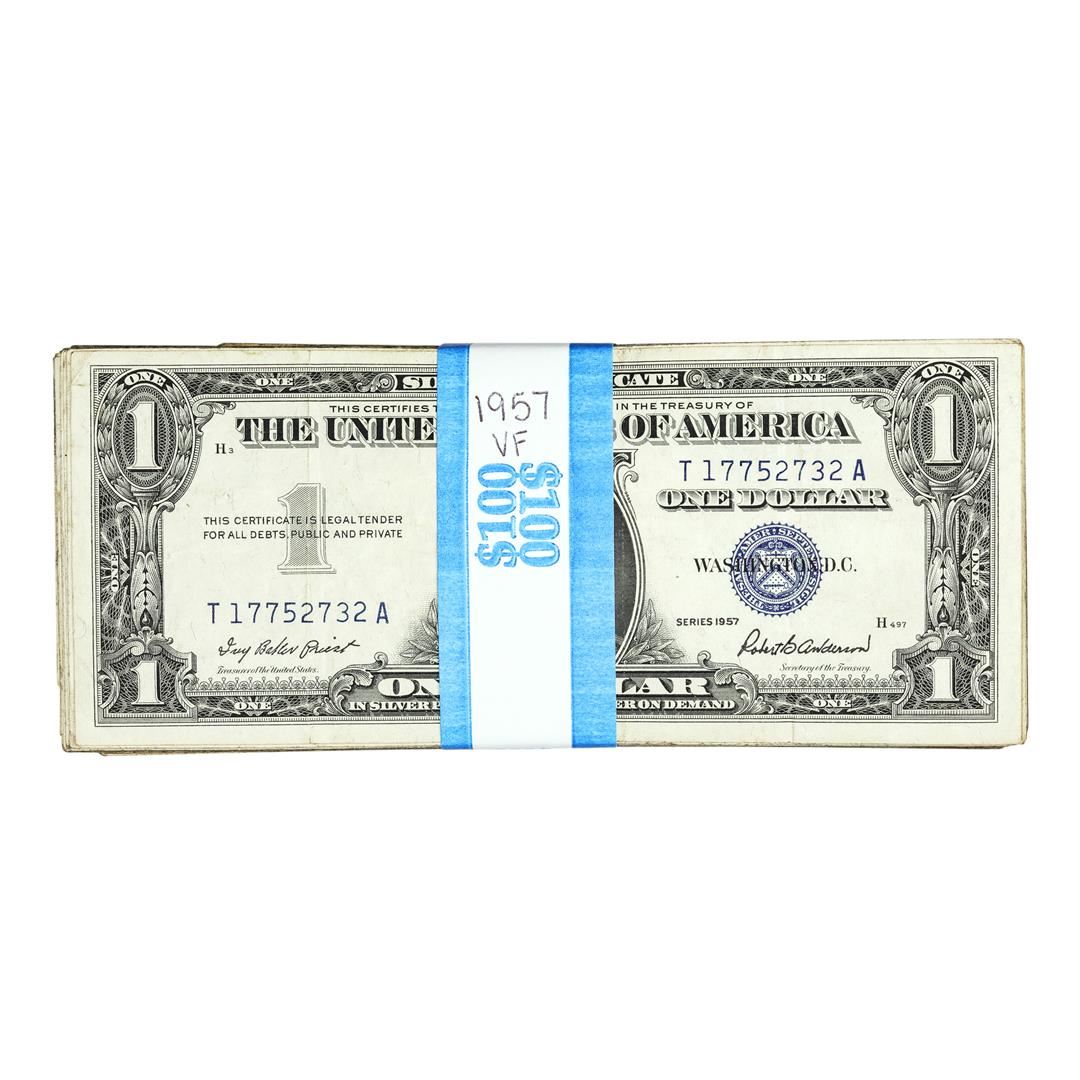 One Lot of (100) 1957 $1 Silver Certificate Notes - Very Fine.