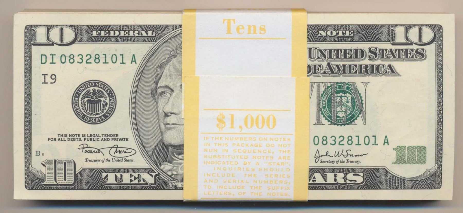 Lot of 100 Consecutive $10 Federal Reserve Notes. Serial number range is I08328101-200A.