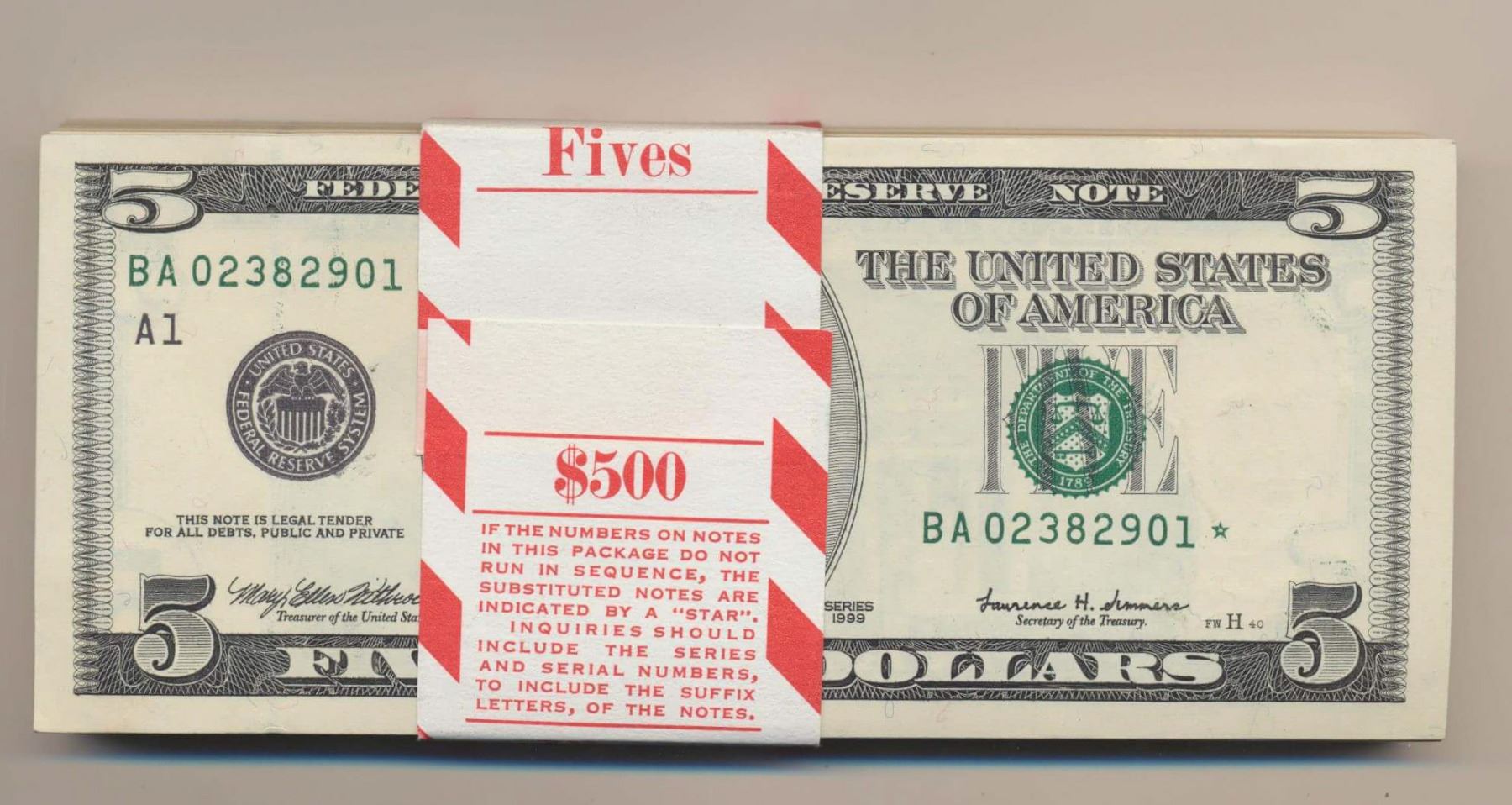 One Lot of 100 Consecutive 1999 $5 Boston Federal Reserve Star Notes.