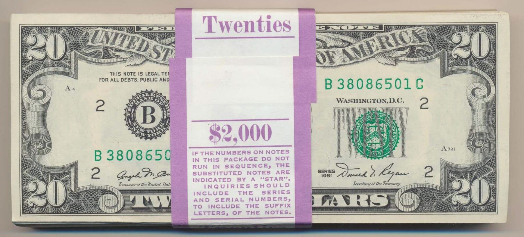 Lot of 100 Consecutive $20 Federal Reserve Notes. Serial number range is B38086501-600A.