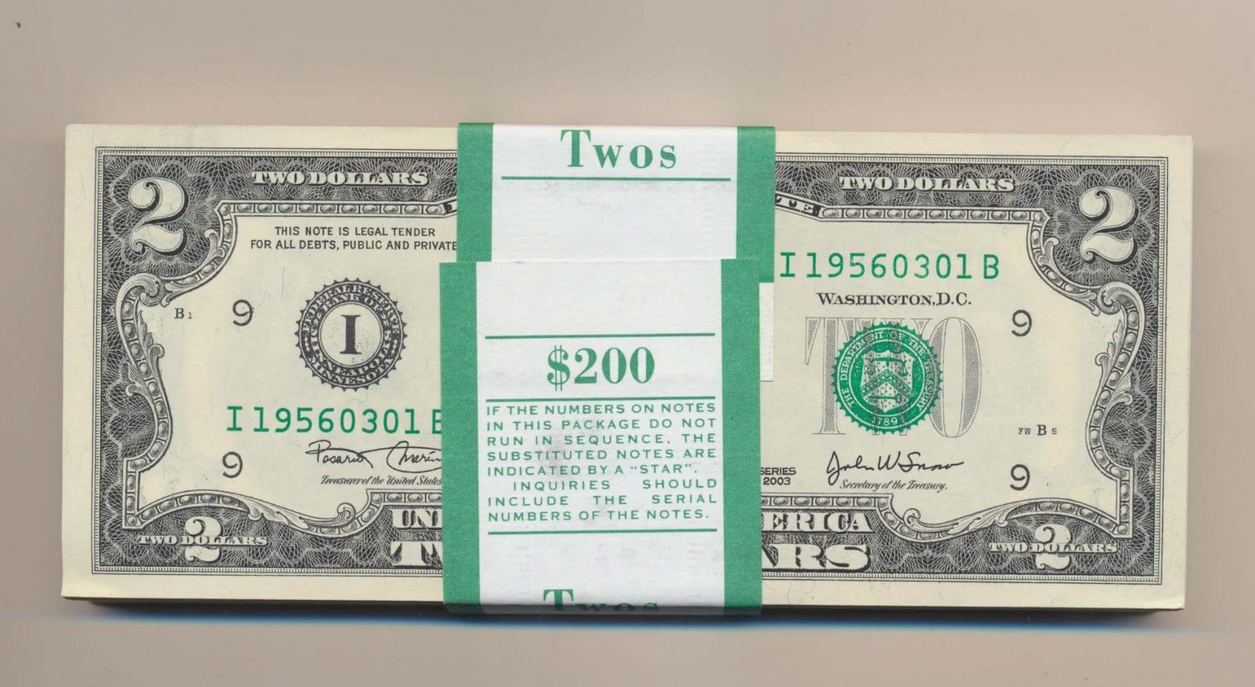 Lot of 100 Consecutive 2003 $2 Minneapolis Federal Reserve Star Notes