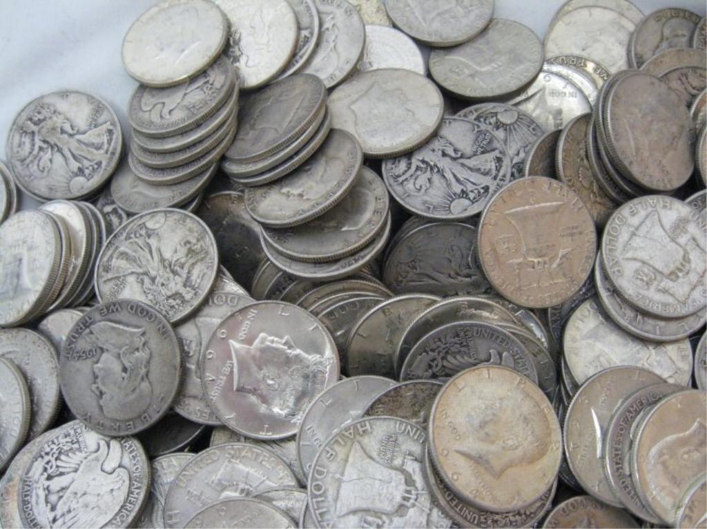 A lot of 100 mixed type, Franklin, Walker's, and Kennedy halves. 90% silver assorted mint marks.