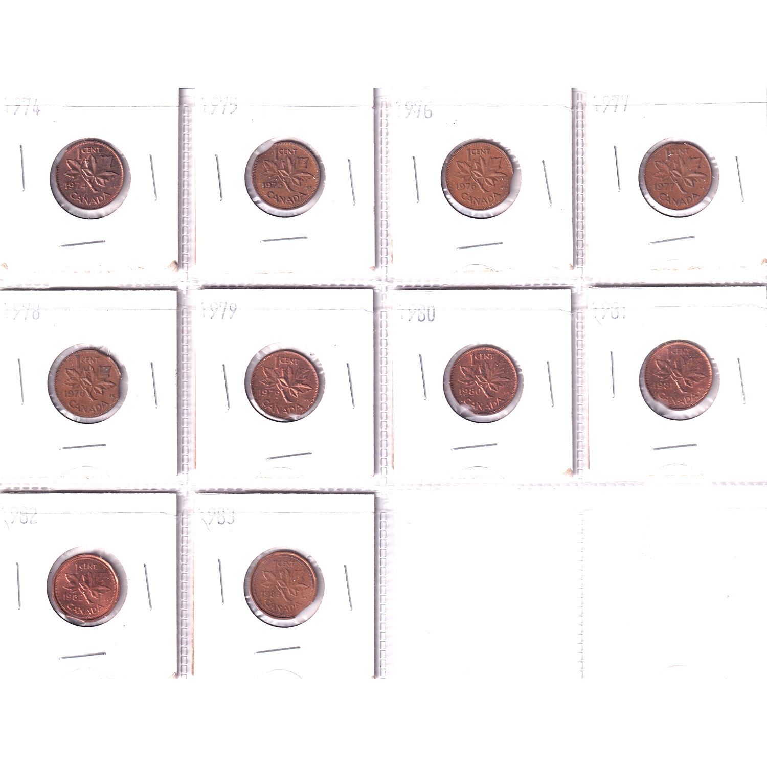 Lot of 10x 1974-1983 Canada Clipped Planchet Pennies. Lot Includes: 1974 through 1983. Please view images for details and quality. 10pcs.