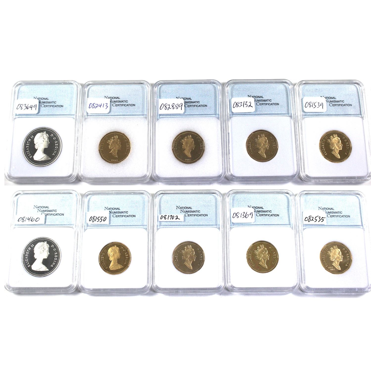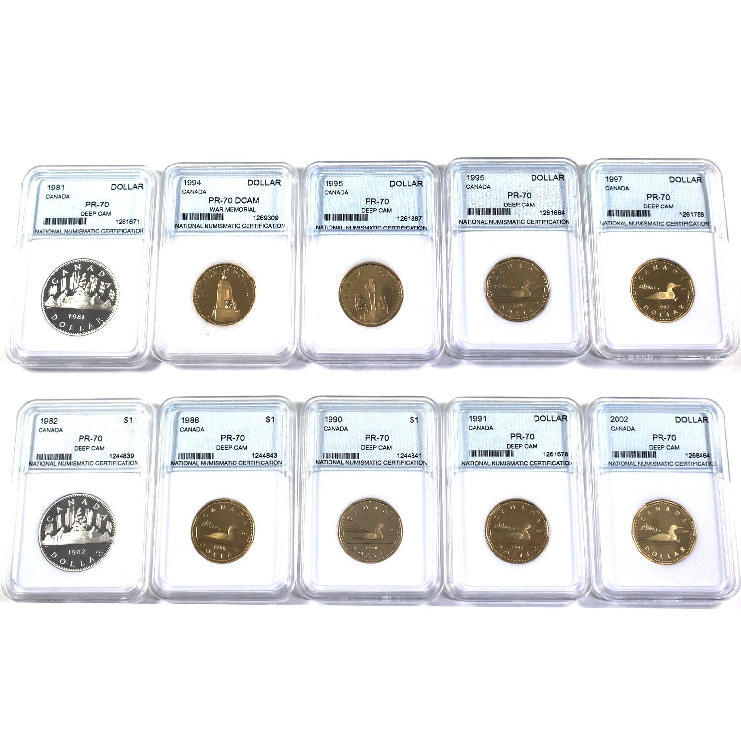 Lot of 10x 1981-2002 Canada Dollar, NNC Certified PR-70, DCAM. Lot Includes: 1981; 1982; 1988; 1990; 1991; 1994 War Memorial; 1995; 1995 Peacekeeping; 1997; & 2002. 10pcs.