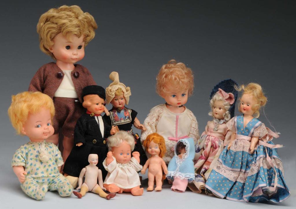 Description This lot consists of seven dolls of either plastic or vinyl, along with, one small bisque doll with long stockings, a pair of painted bisque dolls wearing Dutch costumes, and one more painted bisque doll in a Storybook manor. Condition (Good - Very Good). Size Largest: 12" T.