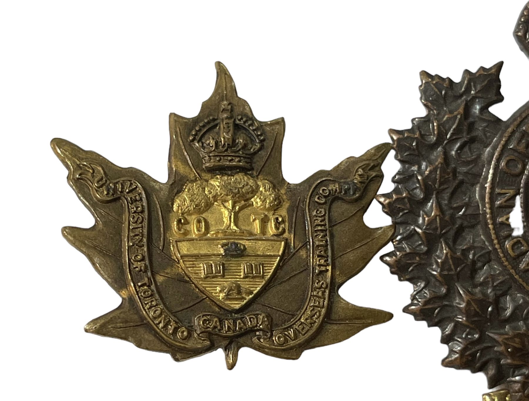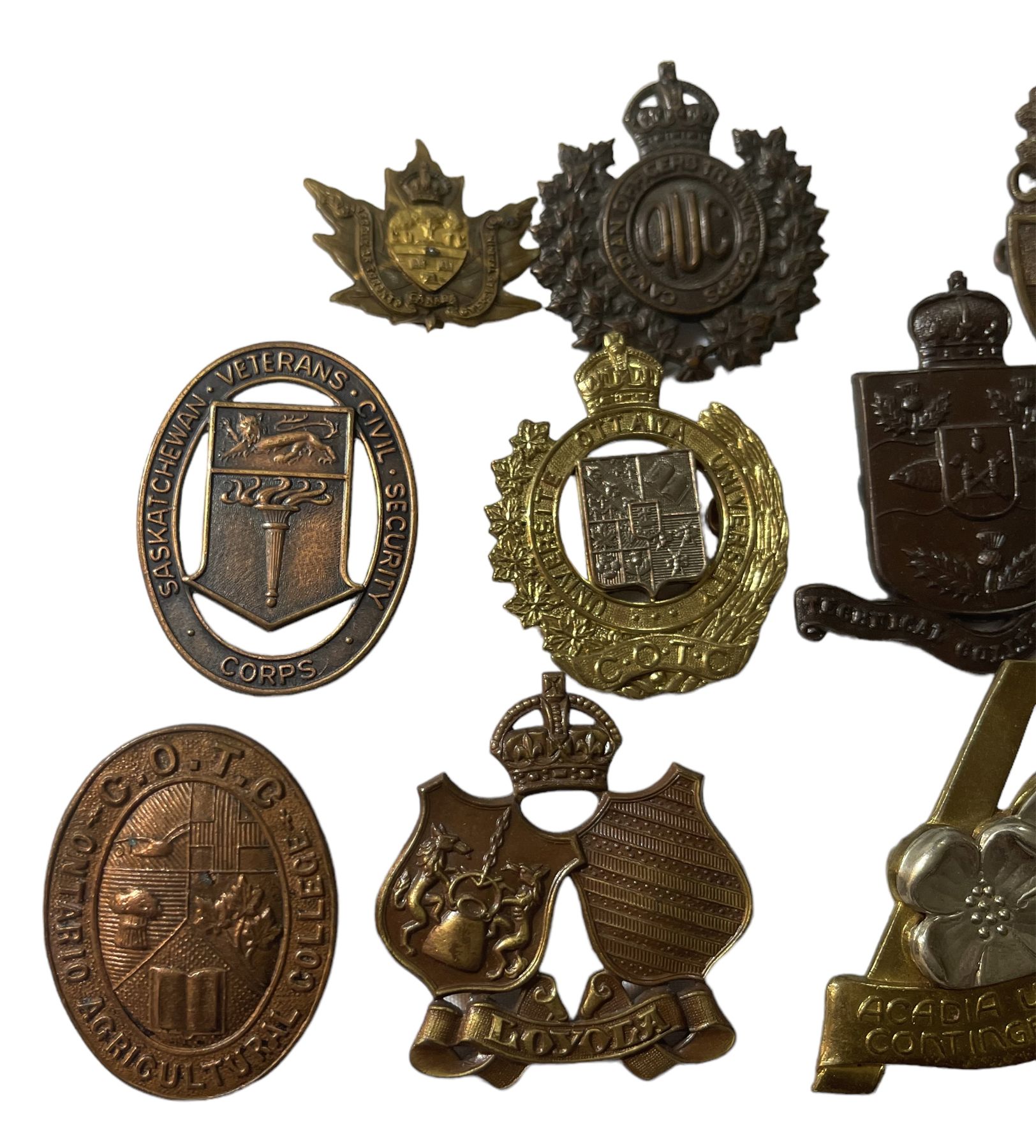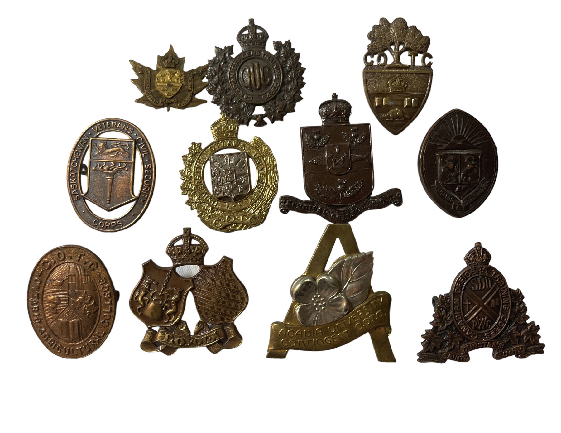 Lot of 11. Includes Toronto Universities Collar & Ontario Agricultural College. One Collar, all the rest are Cap Badges. Ottawa is a reproduction.