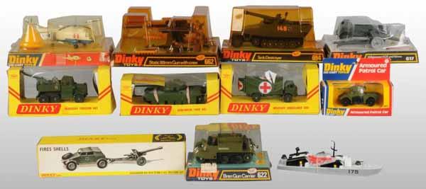 Description Circa 1970s. Includes nine Army vehicles, one helicopter, and one missile boat with four plastic missiles but missing its box. Includes ten original boxes, some with discoloration to plastic coverings and some with tears. Condition (Very Good - Excellent). Size Largest: 10" L.