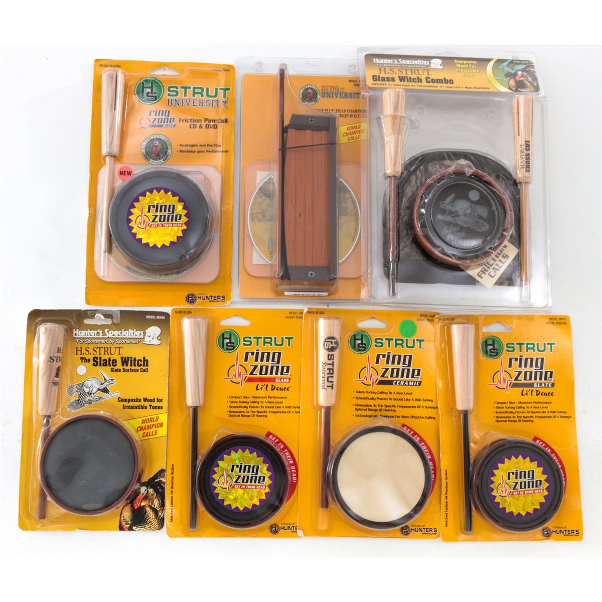 Lot of Eleven (11) Hunter's Specialties Calls, including H.S. Strut Glass Witch Combo; Wild Turkey Box Call; Ring Zone; Slate Witch; Friction Pan Call with CD & DVD. All brand new in original packaging. Est.: $100-$200/lot. (Field Time)