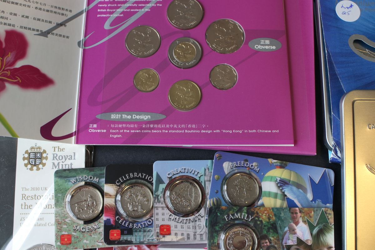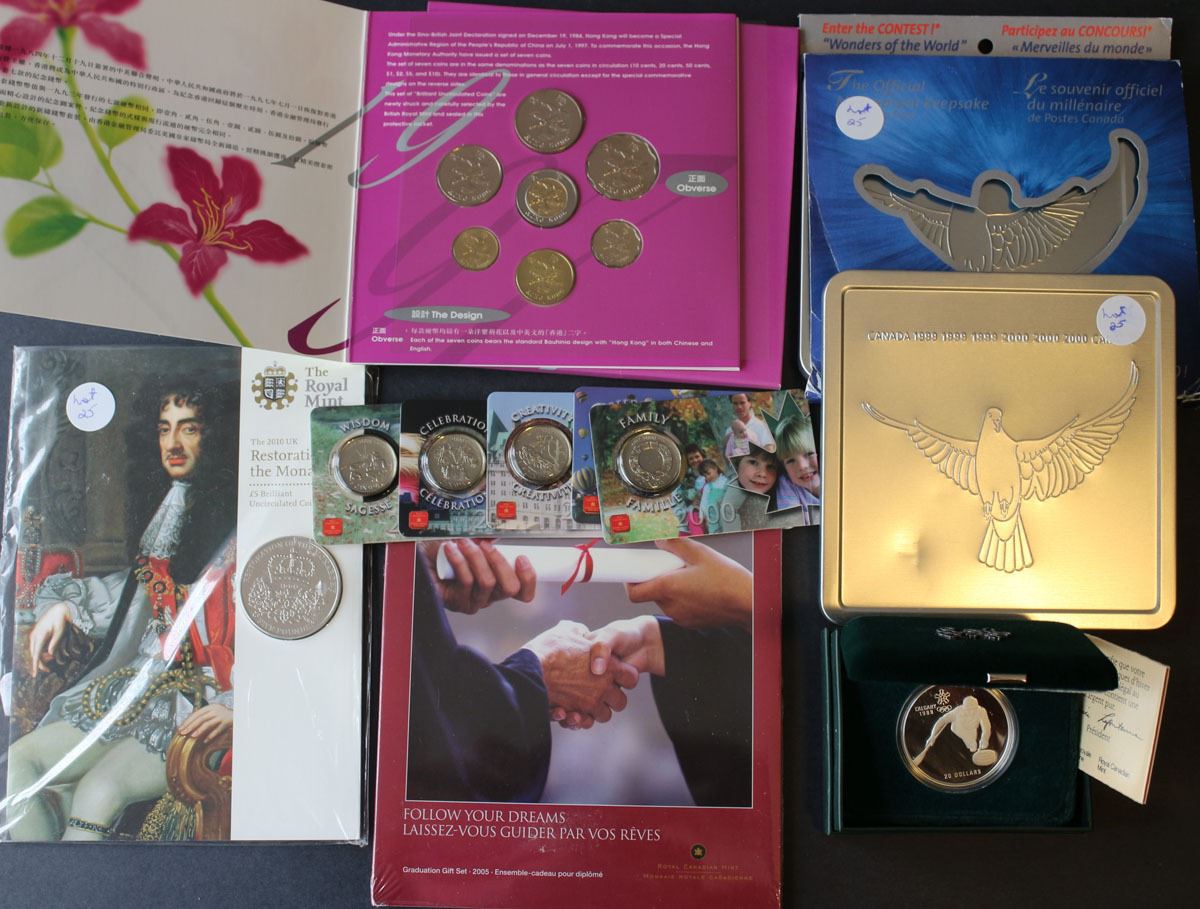 Lot of 11: Royal Mint 2010 Restoration of the Monarchy £5 Brilliant Uncirculated 38.61mm Coin (sealed), Coin Card 2000 Celebration, Coin Card 2000 Creativity, Coin Card 2000 Freedom, 2000 Coin Card Family, 2000 Coin Card Wisdom, 1988 Calgary Olympic .925 Silver Twenty Dollar Coin, RCM 2005 Graduation 7-Coin Set (sealed, unopened), 1997 7-coin Great Britain - Hong Kong Set, 2x Millennium Keepsake "Wonders of the World" (2000 Millennium Official Keepsake by Canada Post. This set includes the 3 stamps, and the millennium medallion featuring the Dove and Canada's maple leaf)