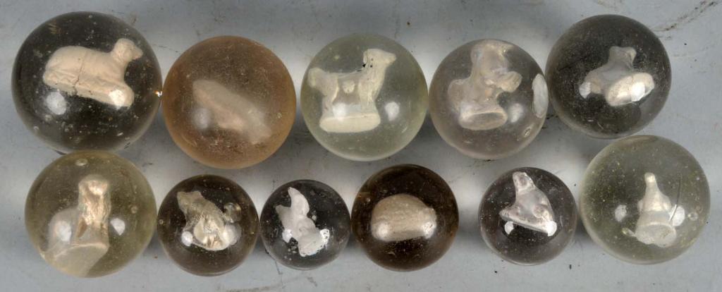 Description Includes a fish, rearing horse, lamb,  smaller dog, lion, possum, squirrel, bird, lamb,  frog, and dog. Largest marble has a crack in dog's  middle with minor dings overall. Condition (Excellent). Size Largest: 2".