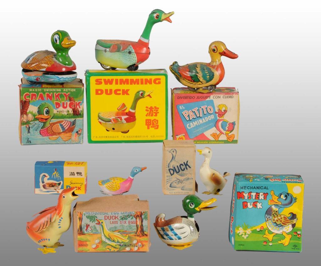 Spanish, Chinese, and Japanese. Working. Two are marked "Made in Occupied Japan" and come with original eggs, two are friction, and nine are wind-up. One Occupied Japanese duck is hand-painted and one is lithograph. Includes original boxes, some with missing flaps. Not all pictured. Condition (Very Good - Excellent). Size Largest: 5" L.