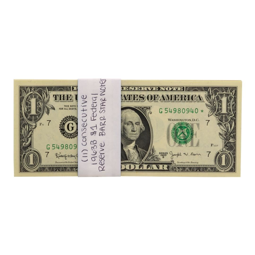 One Lot of (11) Uncirculated 1963B $1 Federal Reserve BARR STAR Notes.