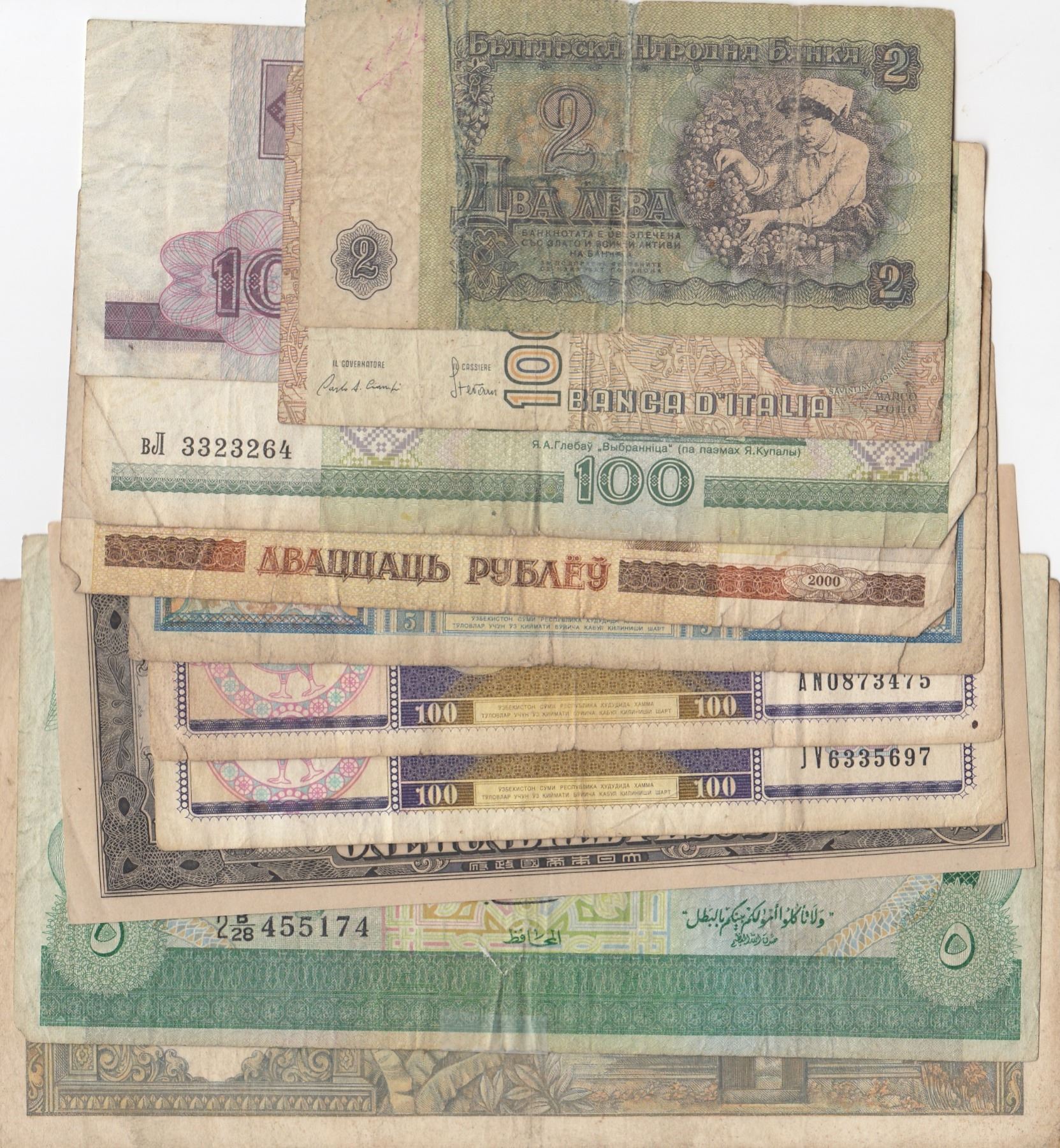 Lot of 11 banknotes; Between FINE and XF conditionbr/Italy, 100 Lire; Cambodia, 500 Riels; Bulgaria, 2 Leva; Uzbekistan, 100 Som (2); Uzbekistan, 5 5om;