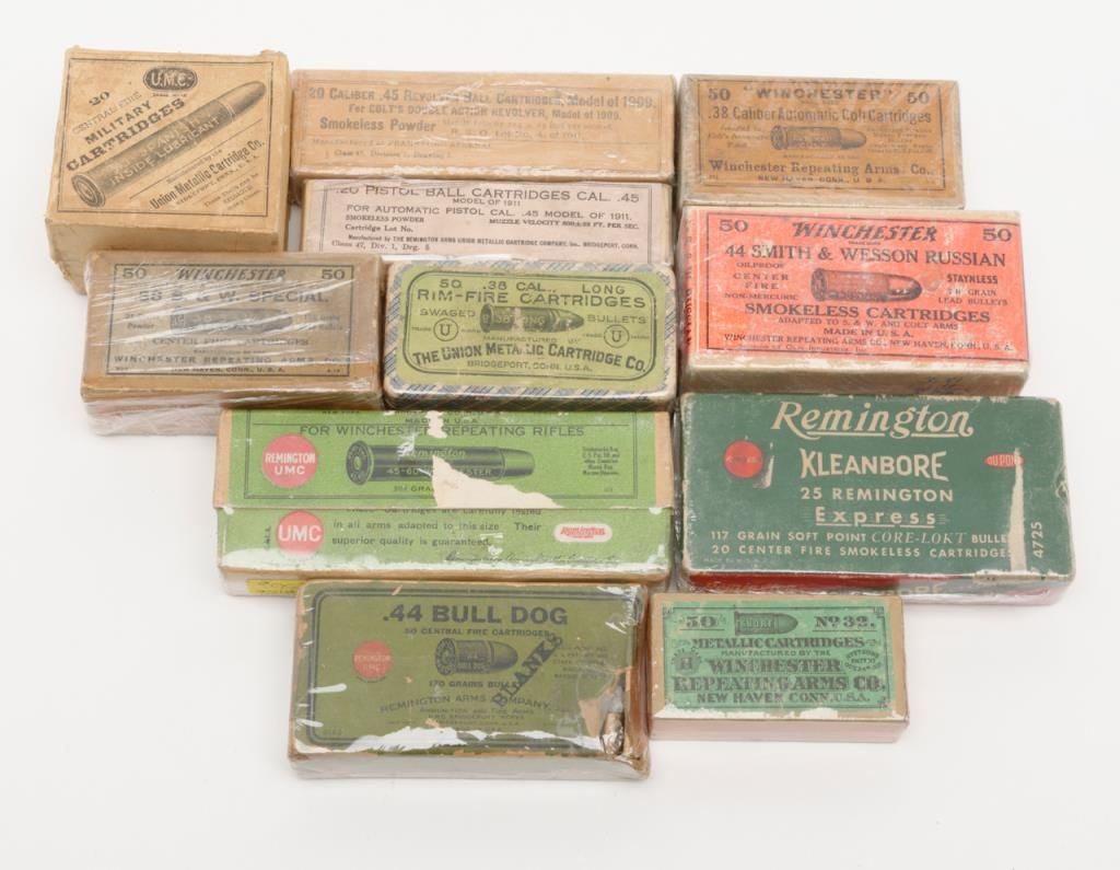 Lot of 11 collector ammunition boxes, most full, including a Winchester .38 auto Colt cartridge box, brown label; a Winchester No. 32 box of .32 short RF, green and orange label; Remington-UMC green label .45-60 Win.; UMC .38 Long RF withgreen cover label; Winchester .38 S&W Special with green and orange labels; Remington Kleanbore .25 Remington Express cartridges, green and red coloring to box; a box of 1911 UMC pistol ball cartridges, .45 caliber; a box of FrankfordArsenal .45 caliber revolver ball cartridges for the Model 1909 Colt DA; a box of U.M.C. .43 Spanish cartridges; a near full box of Winchester .44 S&W Russian revolver cartridges with red label and a partial box of Remington-UMC .44 BullDog blanks in green label box with some damage to right side of box. Est.: $500-$1,000.