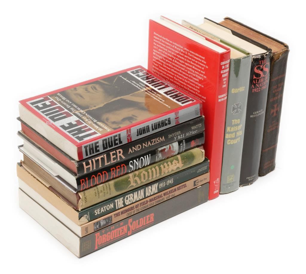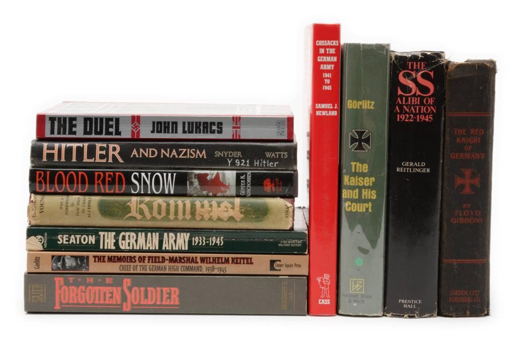 Lot of 11 hardback and softcover books on WW II nazi Germany including Seaton’s The German Army, 1933-1945; Cossacks in the German Army, 1941-1945 by Newland and The Red Knight of Germany by Gibbons. Est.: $75-$100.