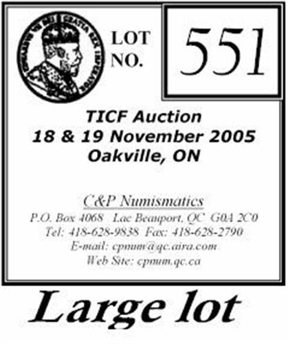 8. The estimates listed are taken from the Canadian coin news, Charlton catalogues, Canadian Dealers News letter, e-bay sales, Cornwell report or the actual market selling/asking prices. We have listed two estimates for each and every lot that represent today’s market. Most lots should sell between the two estimates. Better material or more popular lots will command a premium and should sell closer to the highest estimate or even more. Estimates are fair and very reasonable, please bid accordingly. No lot should sell less than 50% of the lowest estimates. With a bid of 100% of the lowest estimate , you have a fair chance of succeeding, with a bid of 100% of the highest estimate, you will be likely to succeed