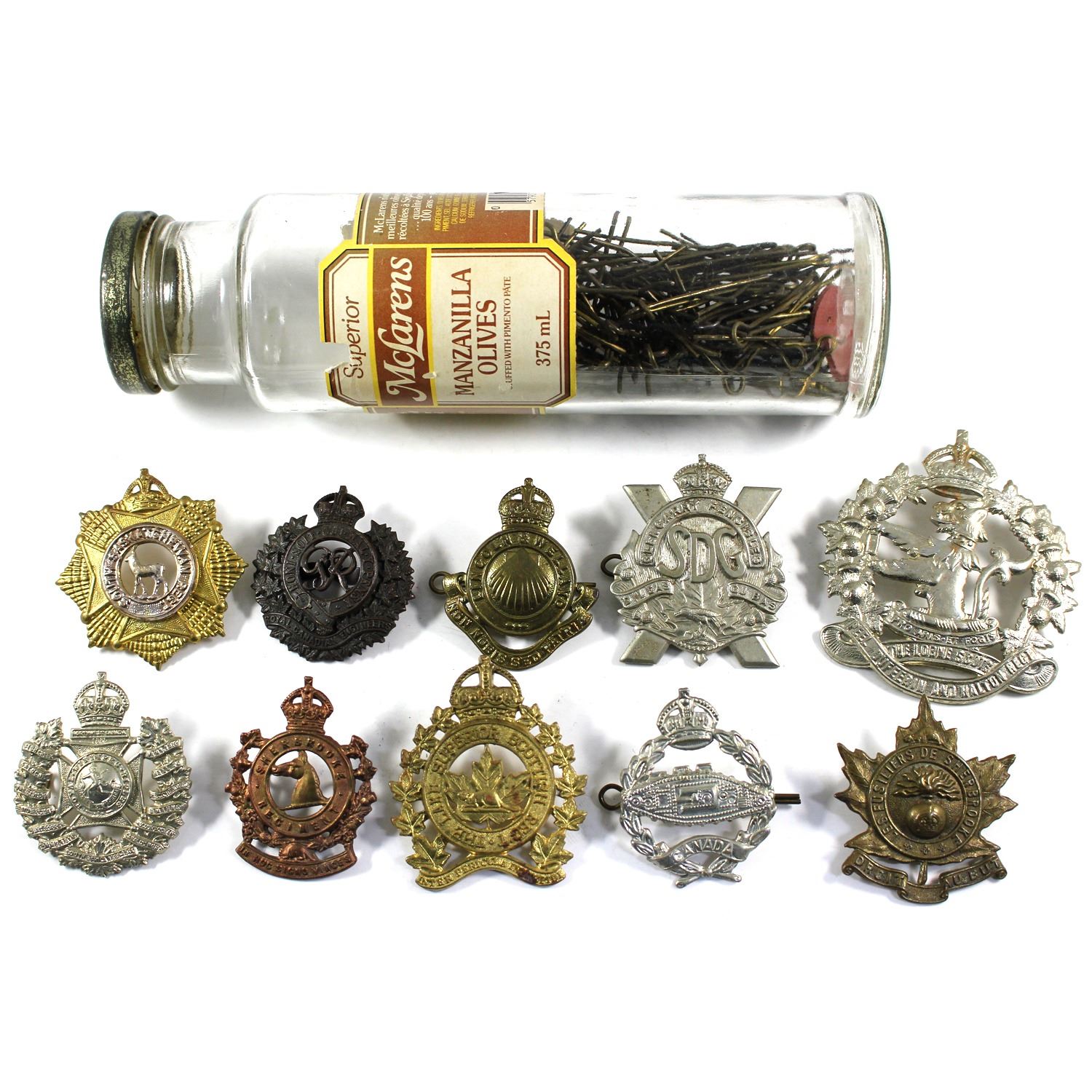 Lot of 11x Assorted Military Badges and Badge Pins. Includes a Glass Jar of mixed Badge Backing Pins, Glengarry Fencibles Badge, Lincoln & Welland Badge, South Saskatchewan Regiment Badge, Royal Winnipeg Rifles Badge, Royal Canadian Engineers Badge, Sherbrooke Regiment Badge, Sherbrooke Fusiliers Badge, The Lake Superior Scottish Regiment Badge, Peel Dufferin and Halton Regiment Badge, and Canadian Tank Corps Badge. Items are in average condition.