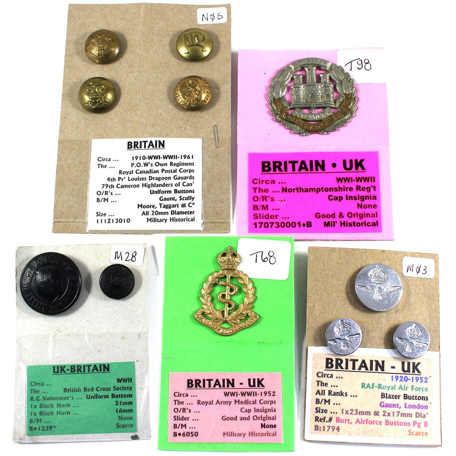 Lot of 11x Great Britain WWII Era Buttons and Badges. Includes Royal Army Medical Corps cap badge, Northamptonshire Regiment cap badge, 2x Britain Red Cross Society Uniform buttons of different sizes, 3x Royal Air Force Blazer buttons of different sizes, and 4x POW's Own Regiment Royal Canadian Postal Corps.