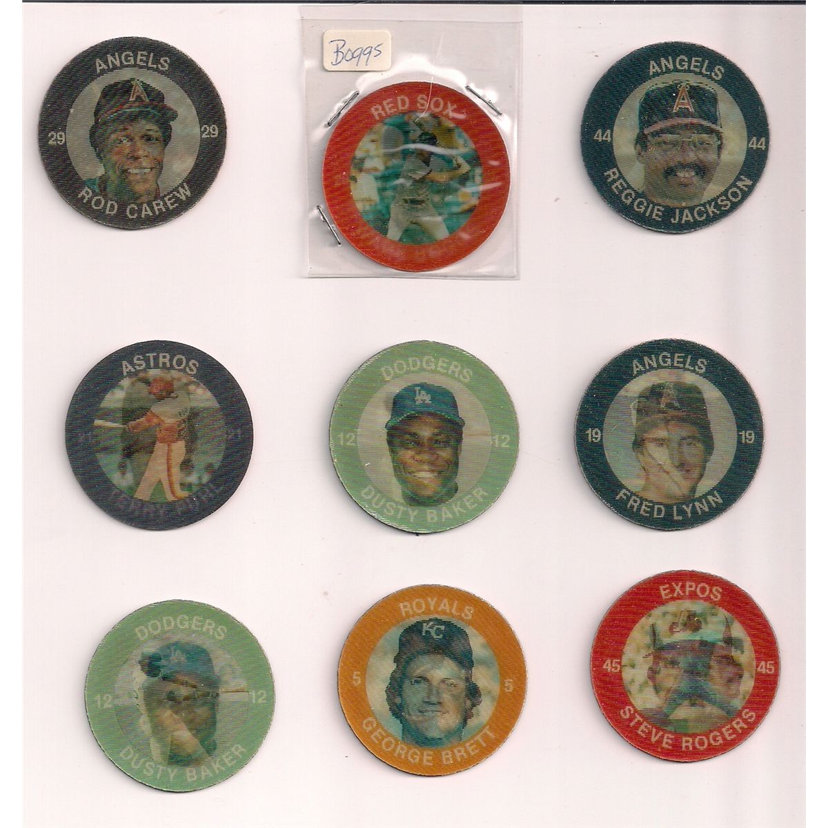 Lot of (12) 1984 7-Eleven Baseball Slurpee Discs. This lot includes Wade Boggs (3), Dusty Baker (2), Rod Carew (2), Reggie Jackson, Terry Puhl, George Brett, Steve Rogers, and Fred Lynn. These discs are in Excellent Condition.