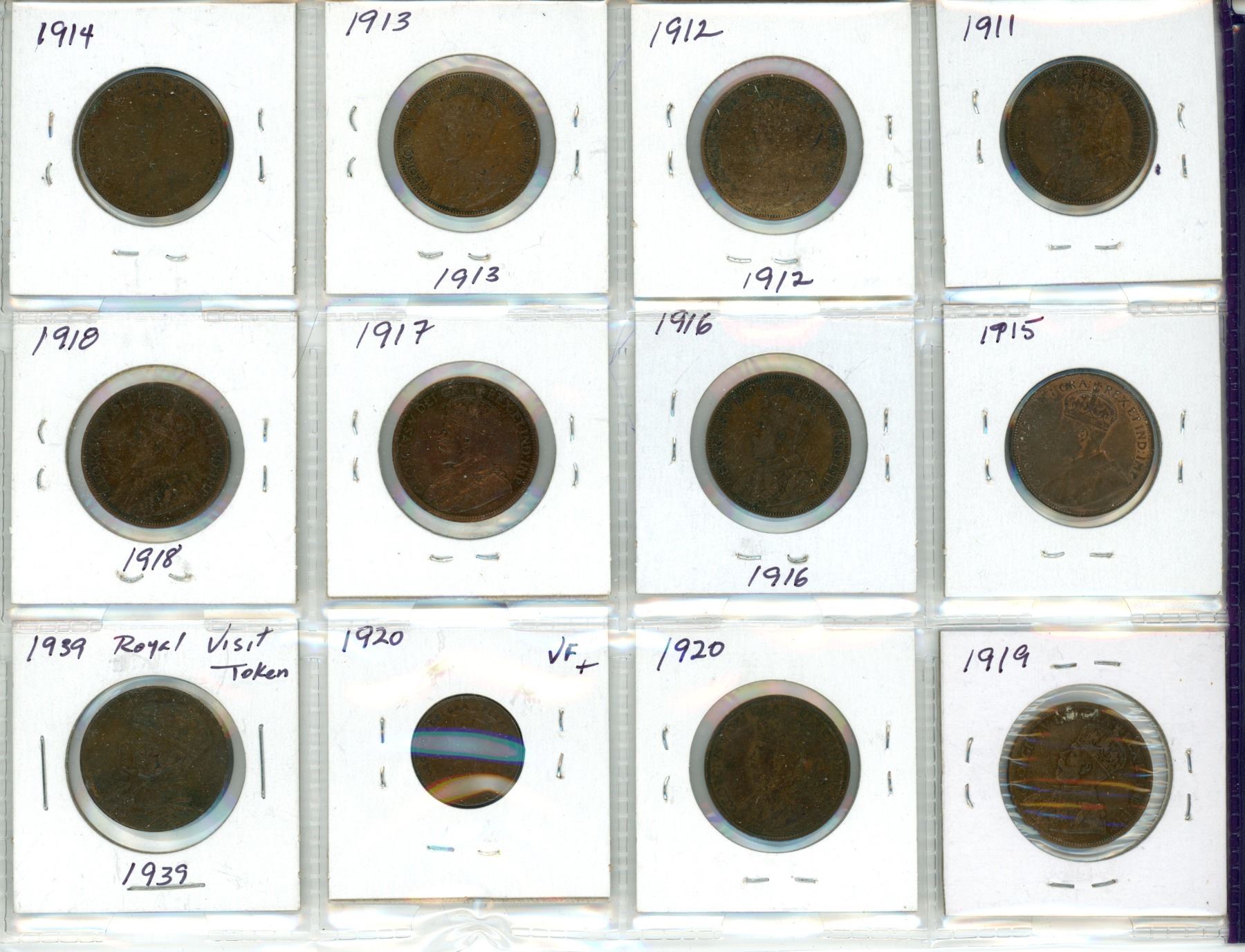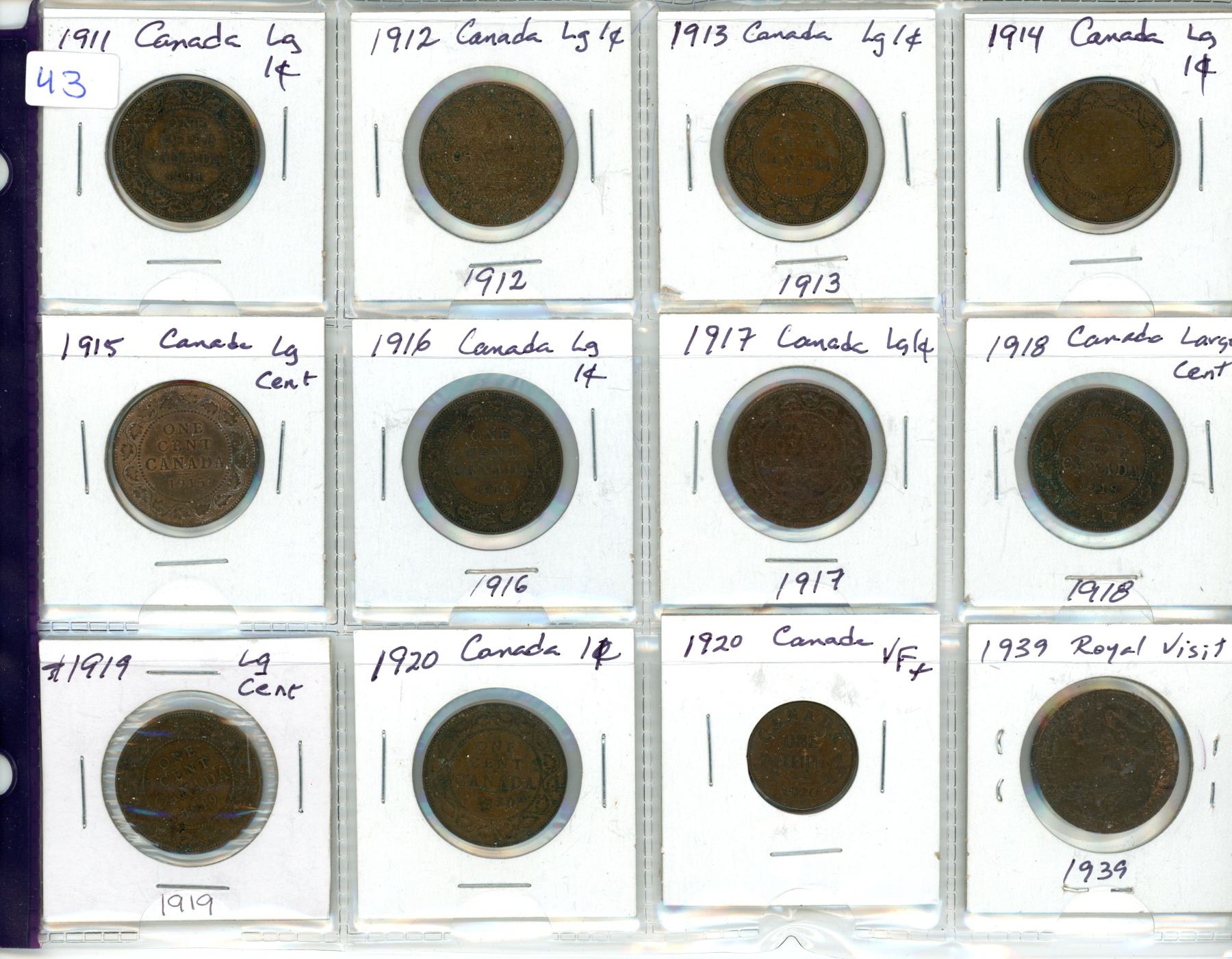 Lot of 12 Canada Large Cents: 1911 - 1919, 1920 (x2), 1939 Royal Visit
