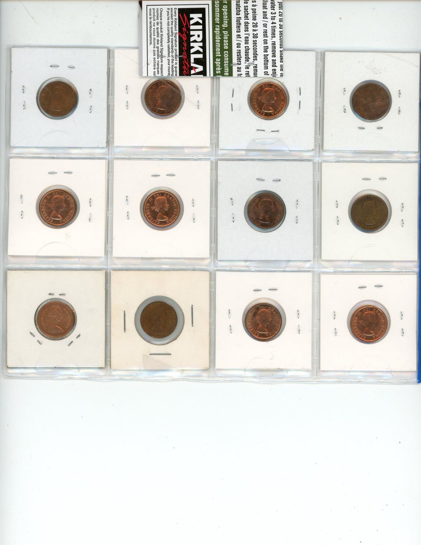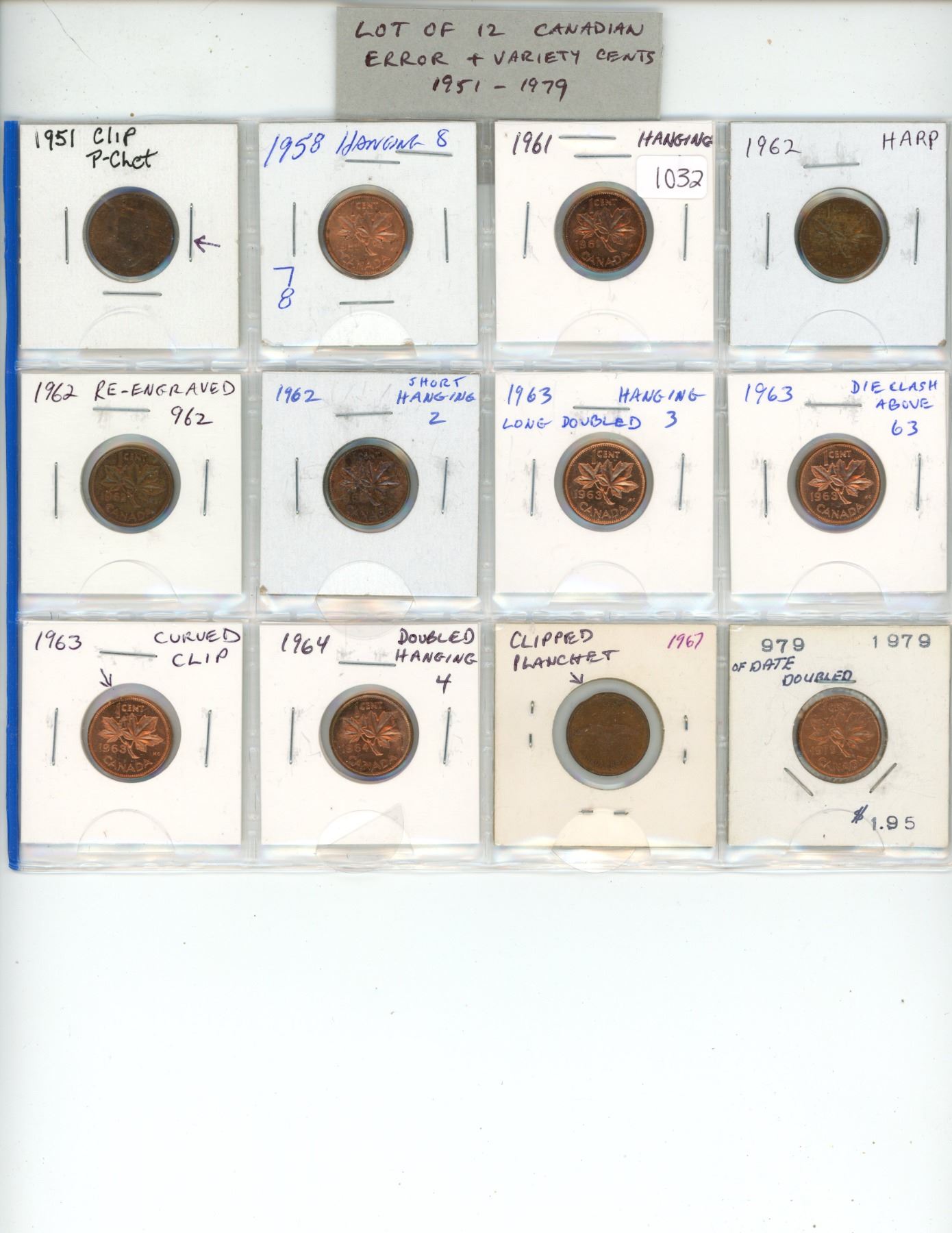 Lot of 12 Canadian Error & Variety Cents 1951 to 1979. Includes clipped planchets with Blakesley Effect, Hanging Numbers from Die Clashes, Harp, Re-Engraved Date, Die Clashes and Doubled Dates. Most are Uncirculated or BU Red. A nice selection rarely seen.