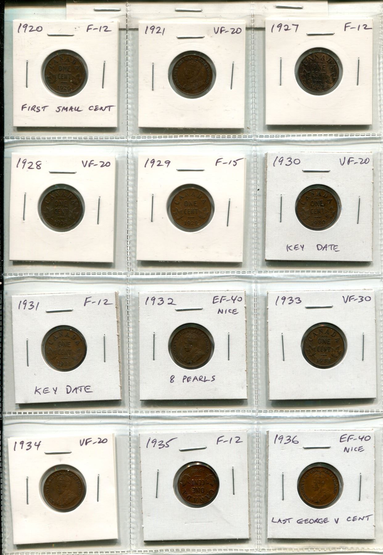 Lot of 12 Canadian George V Small Cents. 1920 to 1936. Missing only 1922 – 1926. Coins grade F-12 to