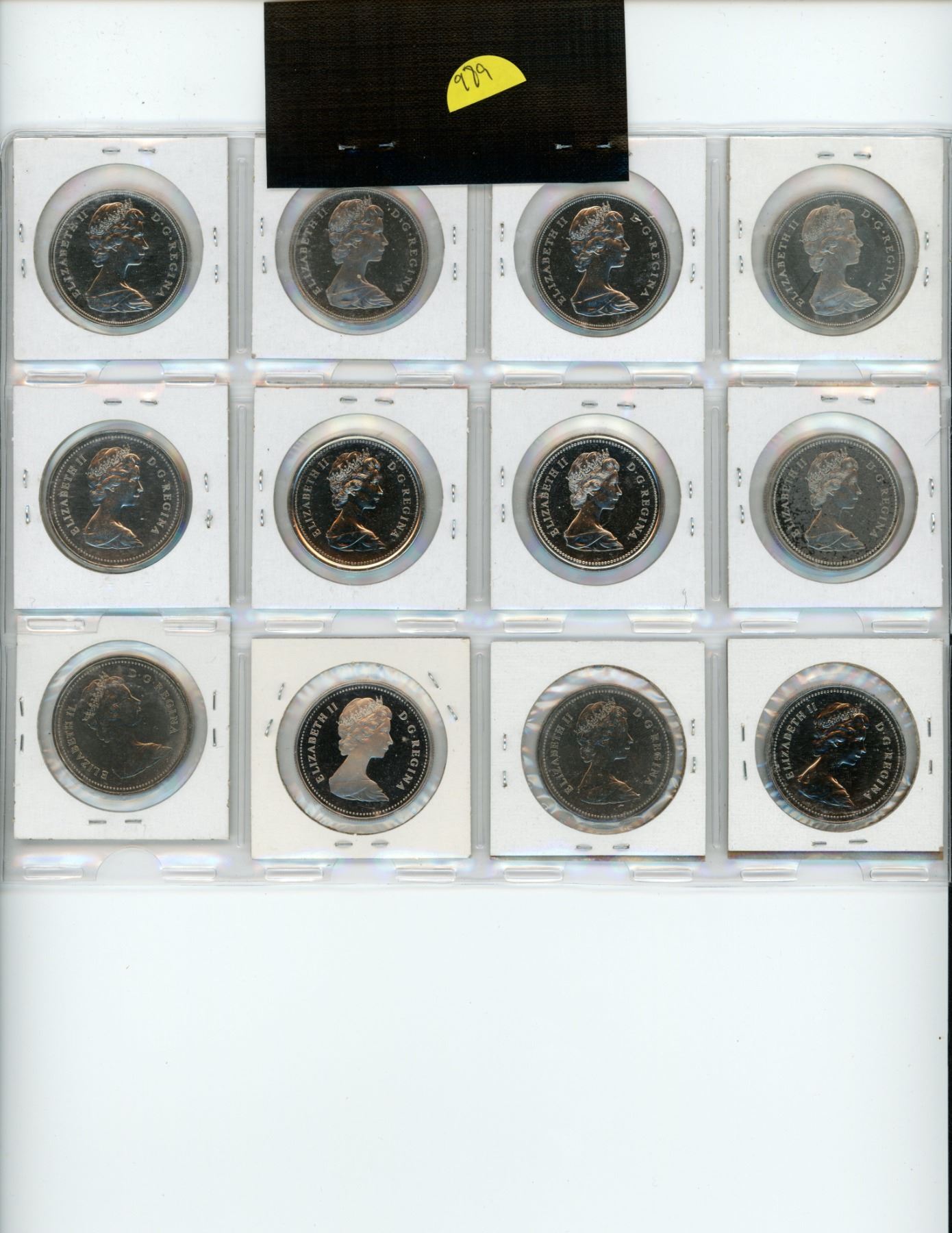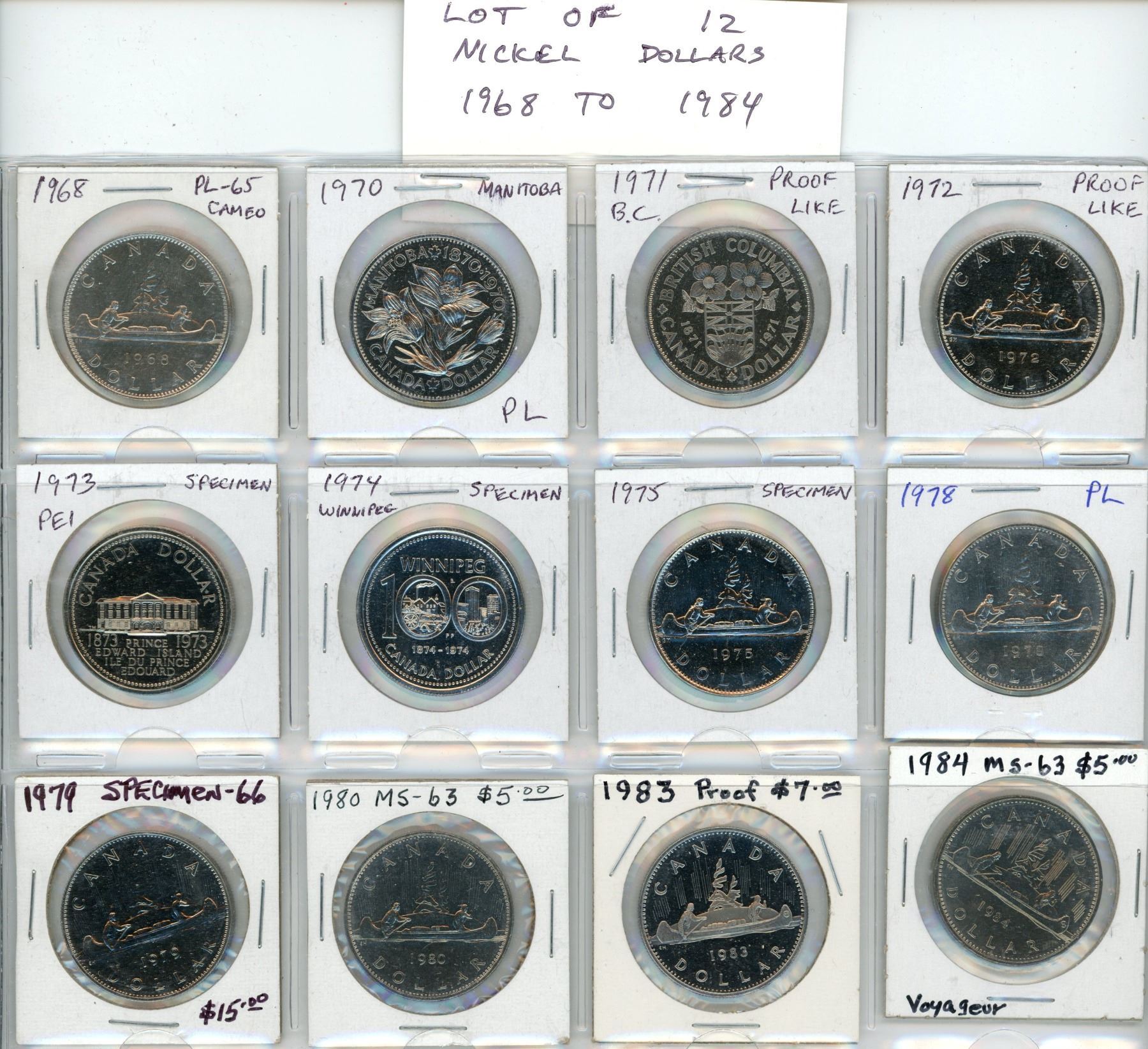 Lot of 12 Canadian Nickel Dollars 1968 to 1984. All coins are Proof Like, Specimen, Proof or BU. A nice selection.